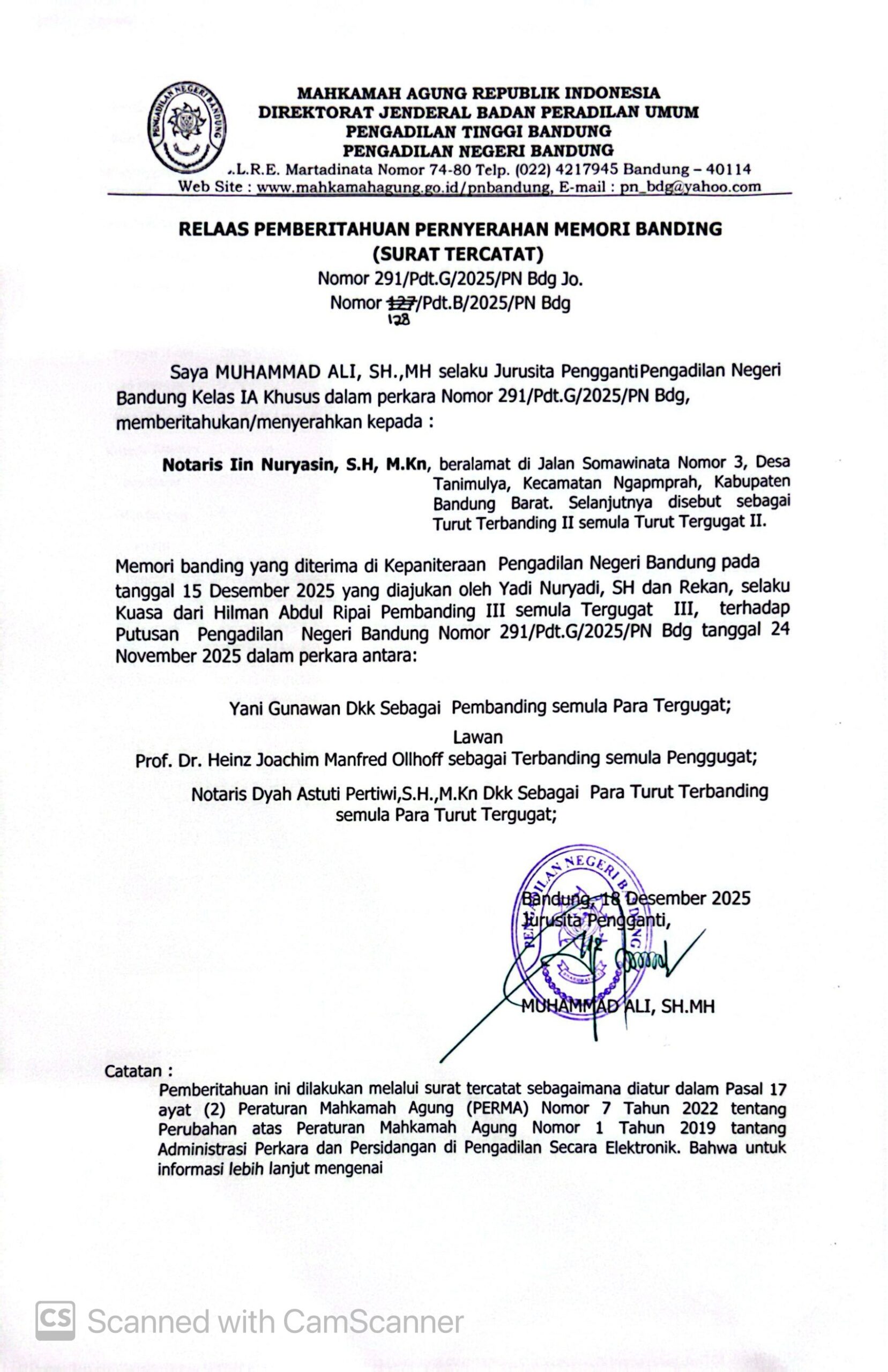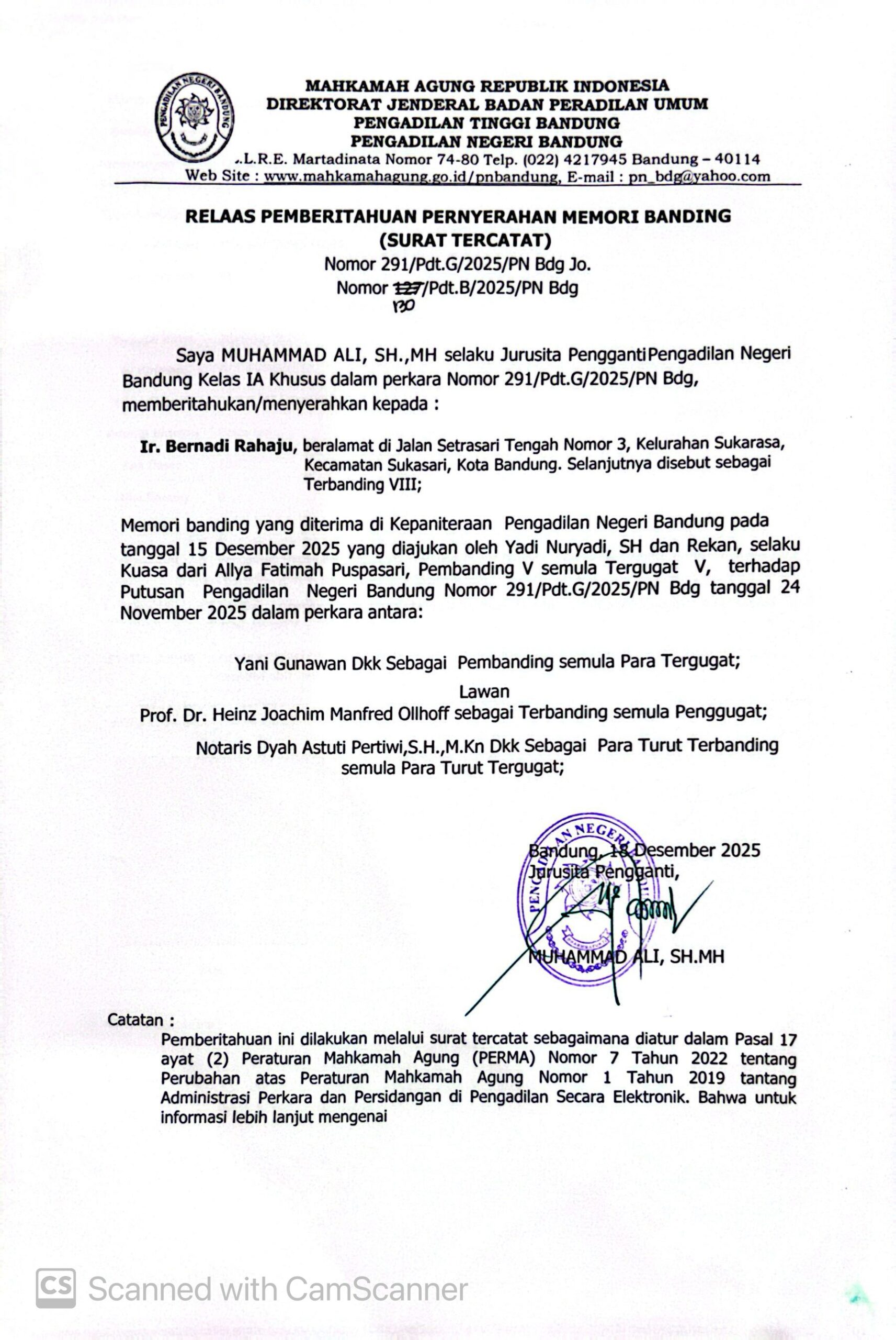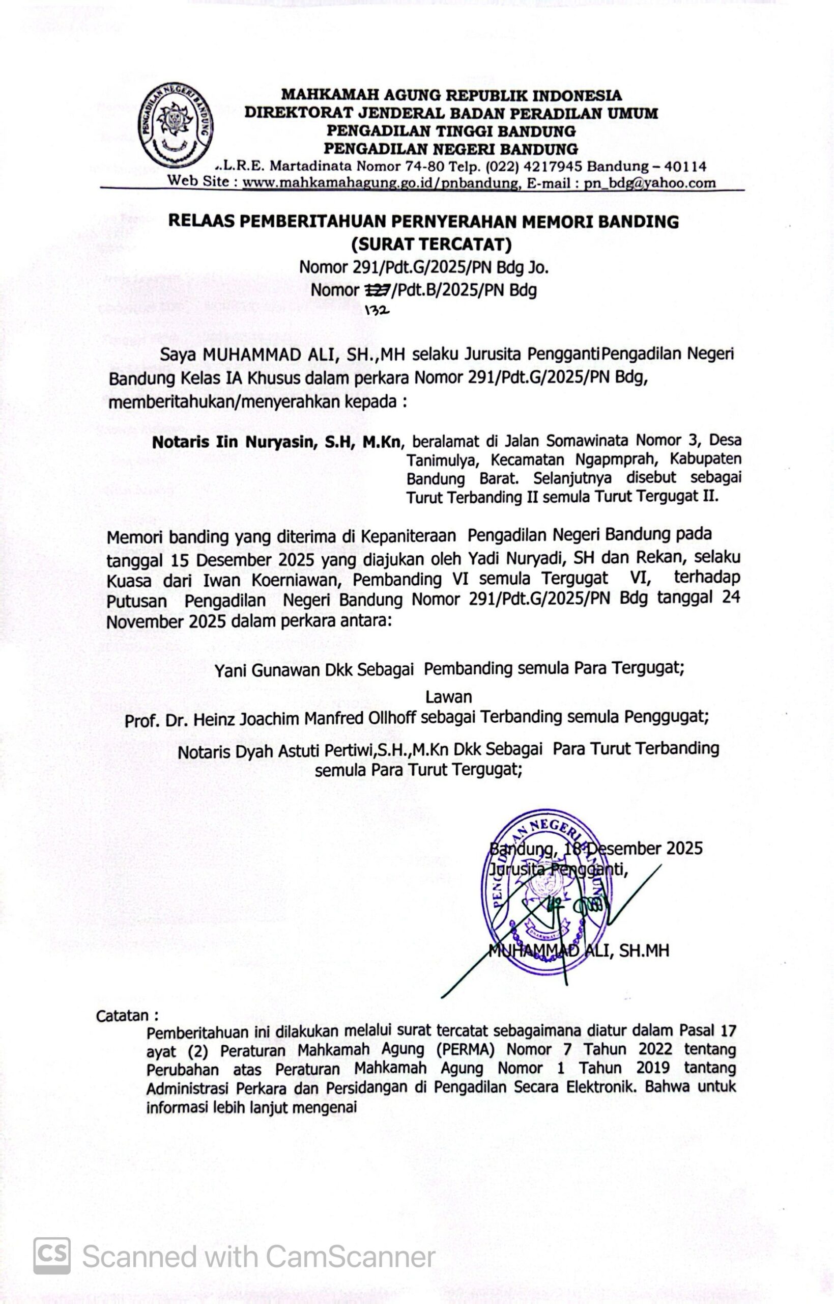Relaas Pemberitahuan Isi Putusan Banding Nomor : 61/Pdt.G/2020/PN Bdg Jo. Nomor : 728/PDT/2025/PT BDG