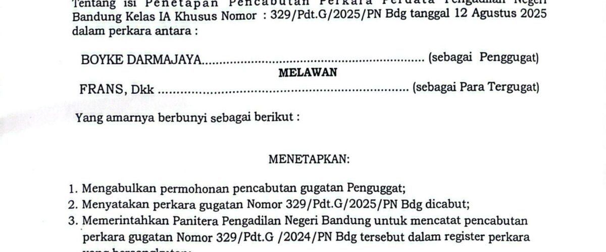 Relaas Pemberitahuan Isi Penetapan Pencabutan Perkara Nomor 329/Pdt.G/2025/PN Bdg