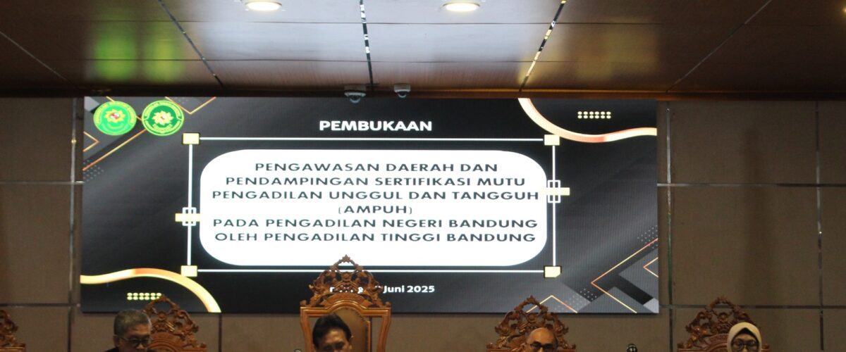 Bandung, 12 Juni 2025 – Pengadilan Tinggi Bandung melaksanakan kegiatan Pengawasan Daerah dan Pendampingan Sertifikasi Mutu Pengadilan Unggul dan Tangguh (AMPUH) di Pengadilan Negeri Bandung pada tanggal 12-13 Juni 2025. Kegiatan ini merupakan bagian dari upaya untuk meningkatkan kualitas layanan peradilan serta memastikan penerapan prinsip-prinsip akuntabilitas, integritas, dan profesionalisme secara konsisten.