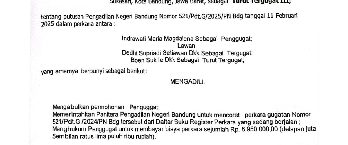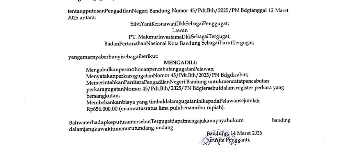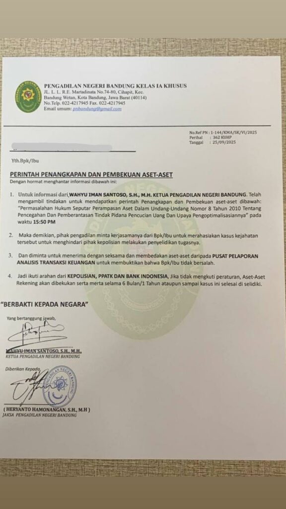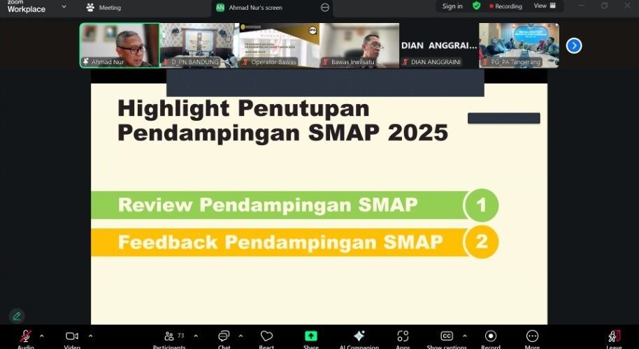 Pengadilan Negeri Bandung mengikuti Acara Penutupan Pendampingan Sistem Manajemen Anti Penyuapan (SMAP) 2025 secara daring. Acara diikuti Para Hakim, sekretaris dan Tim SMAP. Dalam sambutannya, Ketua Pokja SMAP 2025, Djauhar Setyadi, yang juga menjabat sebagai Inspektur Wilayah I Badan Pengawasan Mahkamah Agung (MA) RI, menekankan pentingnya semangat melawan korupsi dan menjaga integritas aparatur peradilan, terutama hakim dan pimpinan.