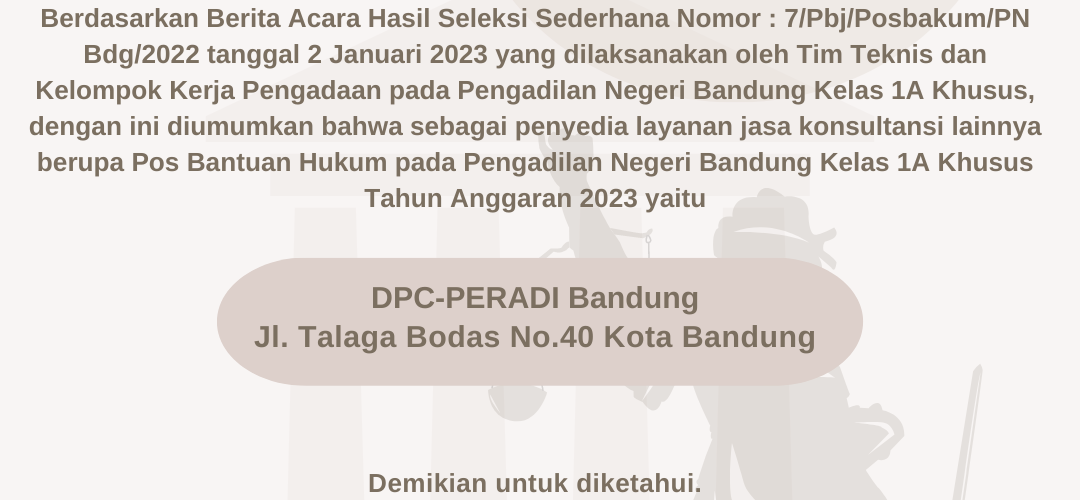 Rabu, 25 Januari 2023 bertempat di ruang rapat Pengadilan Negeri Bandung terdapat dua kegiatan yang telah diikuti. Pertama, Acara Peresmian Pembangunan dan Renovasi Gedung/Bangunan di Lingkungan Mahkamah Agung yang telah diikuti oleh Pimpinan Empat Pilar. Acara yang kedua adalah Pembekalan Persiapan Pendampingan Penilaian Mandiri Pembangunan Zona Integritas secara daring oleh Badan Pengawasan Mahkamah Agung RI dan telah diikuti oleh ketua dan anggota dari masing-masing area.