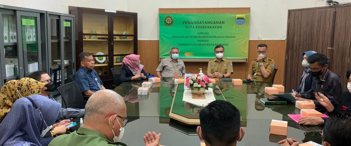 Bertempat diruang rapat telah dilaksanakan acara Penandatanganan Nota Kesepakatan Bersama Pengadilan Negeri Bandung Kelas IA khusus dengan pemerintah kota Bandung hari selasa tanggal 30 Agustus 2022, Adapun susunan acara berlangsung sambutan KPN oleh Bapak Yoserizal, S.H., M.H., sambutan pemerintah kota Bandung dalam hal ini diwakili oleh Kepala Dinas DPMPTSP Kota Bandung kepada Bapak Ronny Ahmad Nurudin, penadatanganan Nota Kesepakatan Bersama diawali oleh pihak pertama Kepala Dinas DPMPTSP Kota Bandung dilanjutkan pihak kedua kepada KPN Bandung, Penyerahan Nota Kesepakatan Bersama dan ditutup acara dengan Penyerahan Cenderamata.