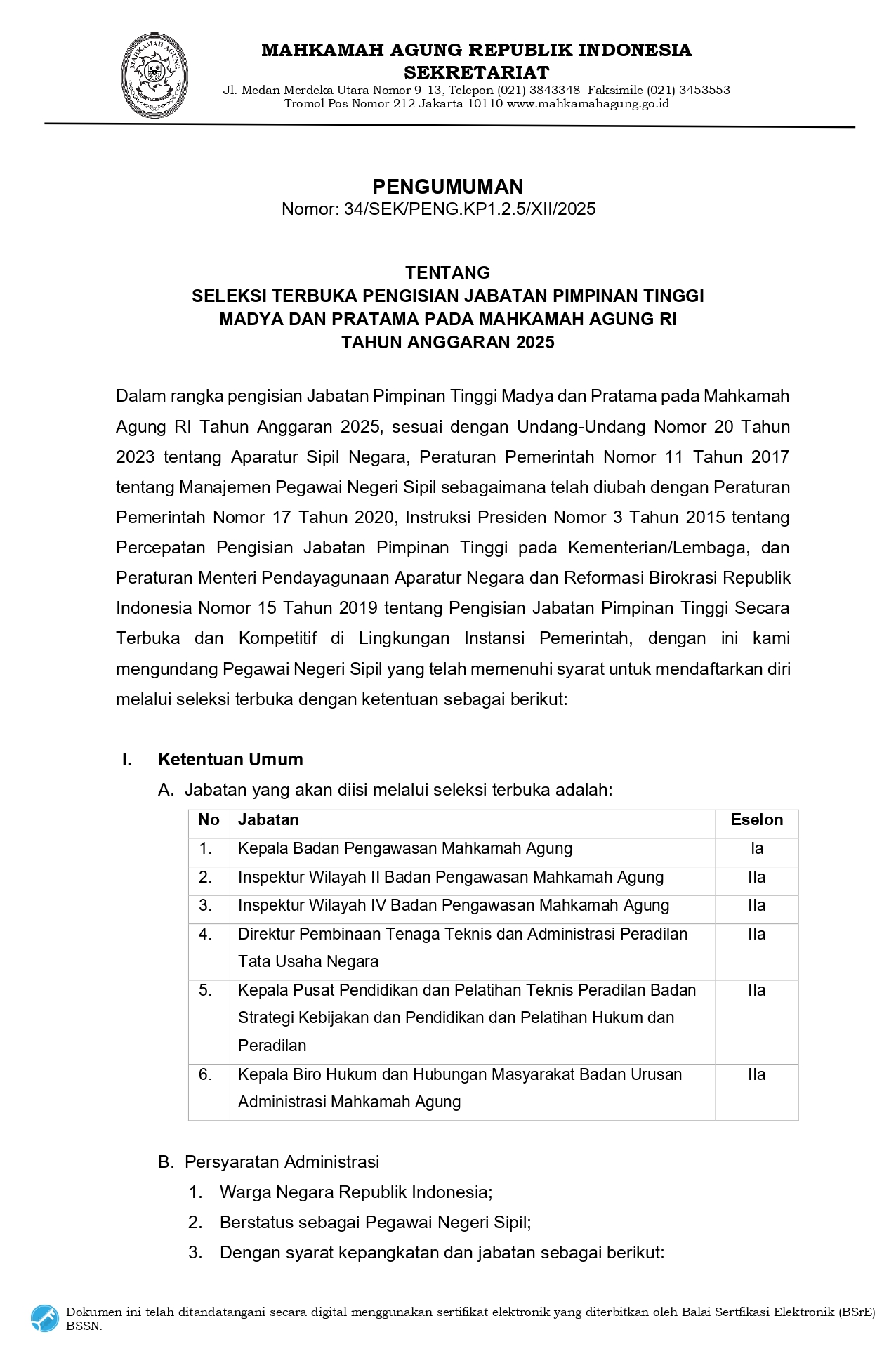 SELEKSI TERBUKA PENGISIAN JABATAN PIMPINAN TINGGIMADYA DAN PRATAMA PADA MAHKAMAH AGUNG RITAHUN ANGGARAN 2025