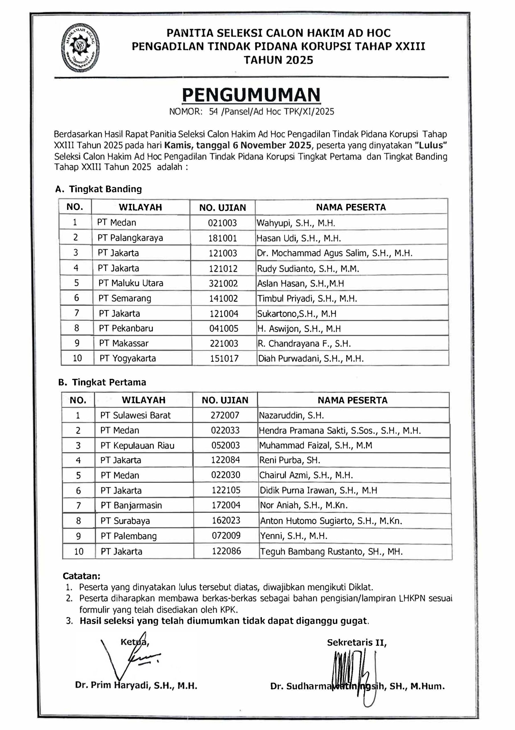 November 11, 2025Hasil Rapat Panitia Seleksi Calon Hakim Ad Hoc Pengadilan Tindak Pidana Korupsi Tahap XXIII Tahun 2025 pada hari Kamis, tanggal 6 November 2025, peserta yang dinyatakan "Lulus" Seleksi Calon Hakim Ad Hoc Pengadilan Tindak Pidana Korupsi Tingkat Pertama dan Tingkat Banding Tahap XXIII Tahun 2025 ...