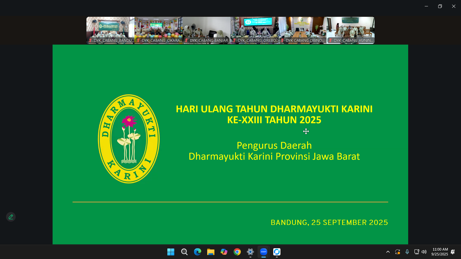 September 26, 2025Dharmayukti Karini Cabang Bandung mengikuti acara Hari Ulang Tahun Dharmayukti Karini XXIII Tahun 2025, yang akan diselenggarakan oleh Pengurus Daerah secara virtual melalui zoom meeting. ...