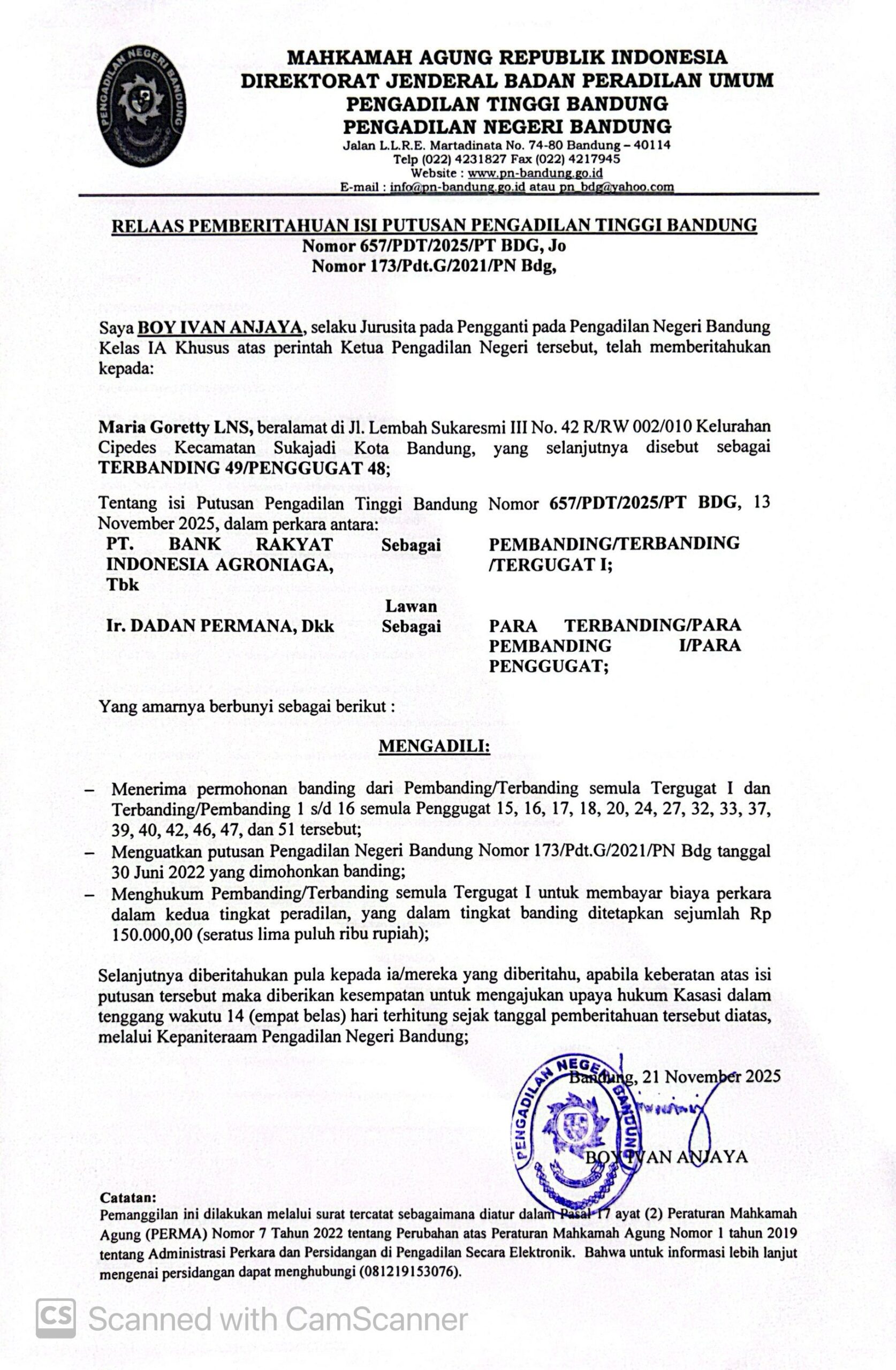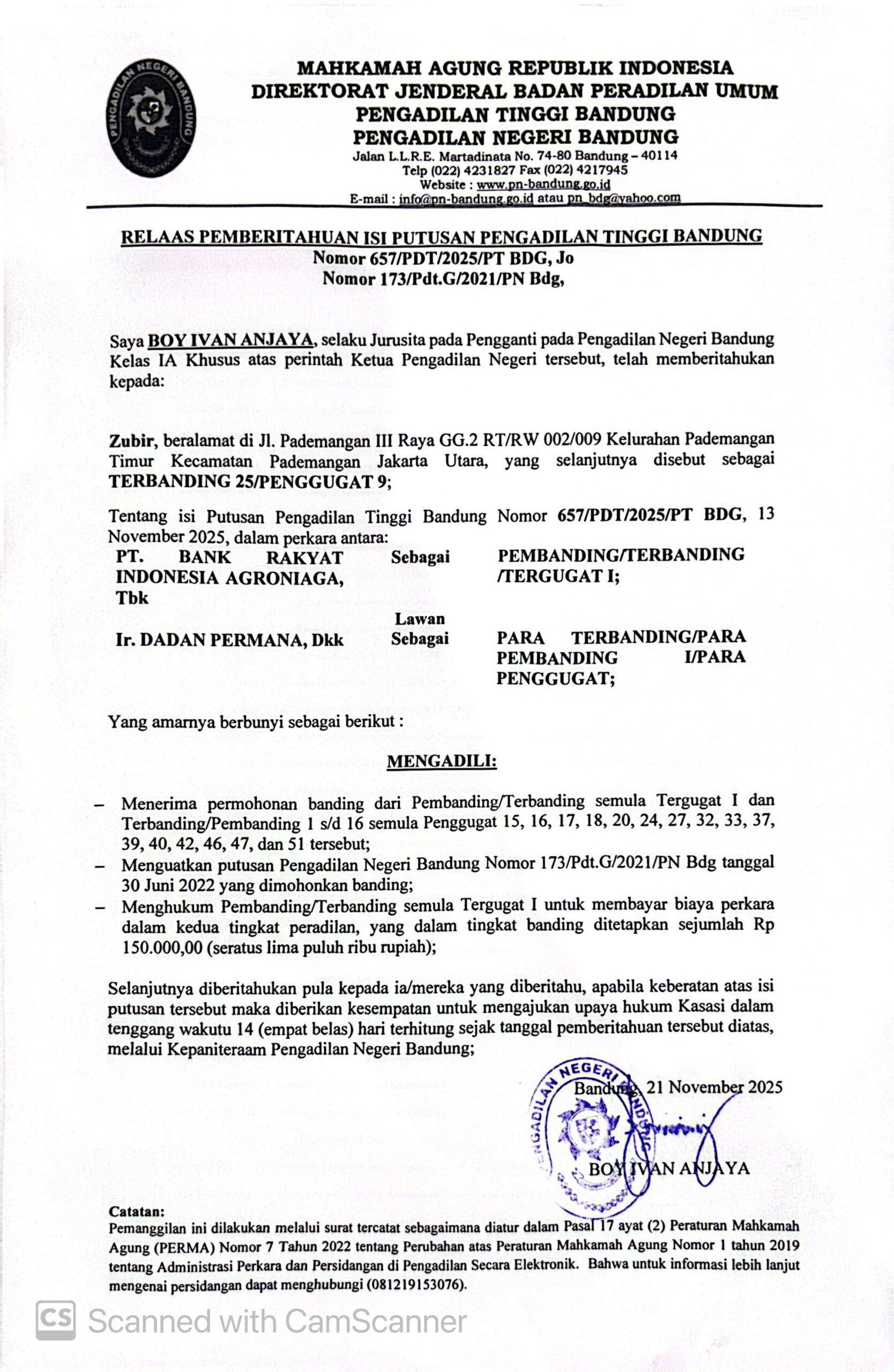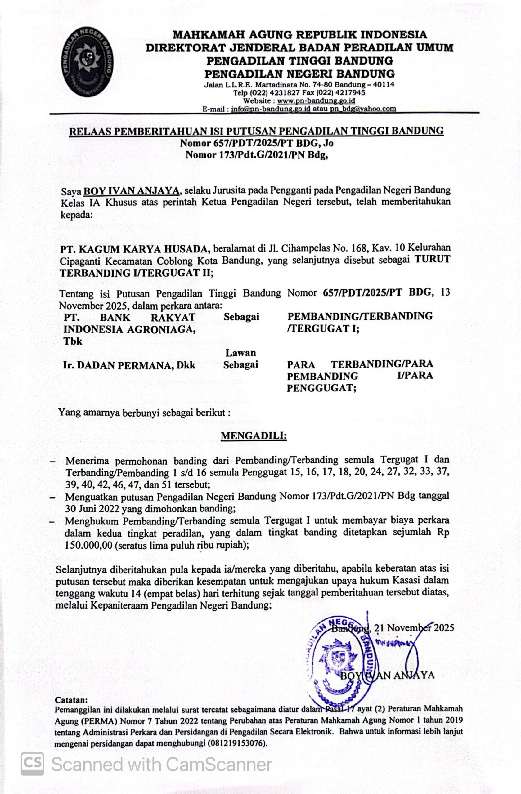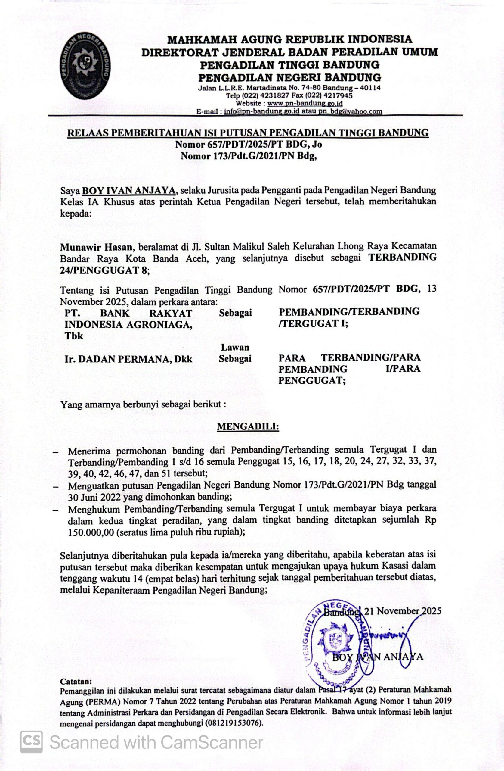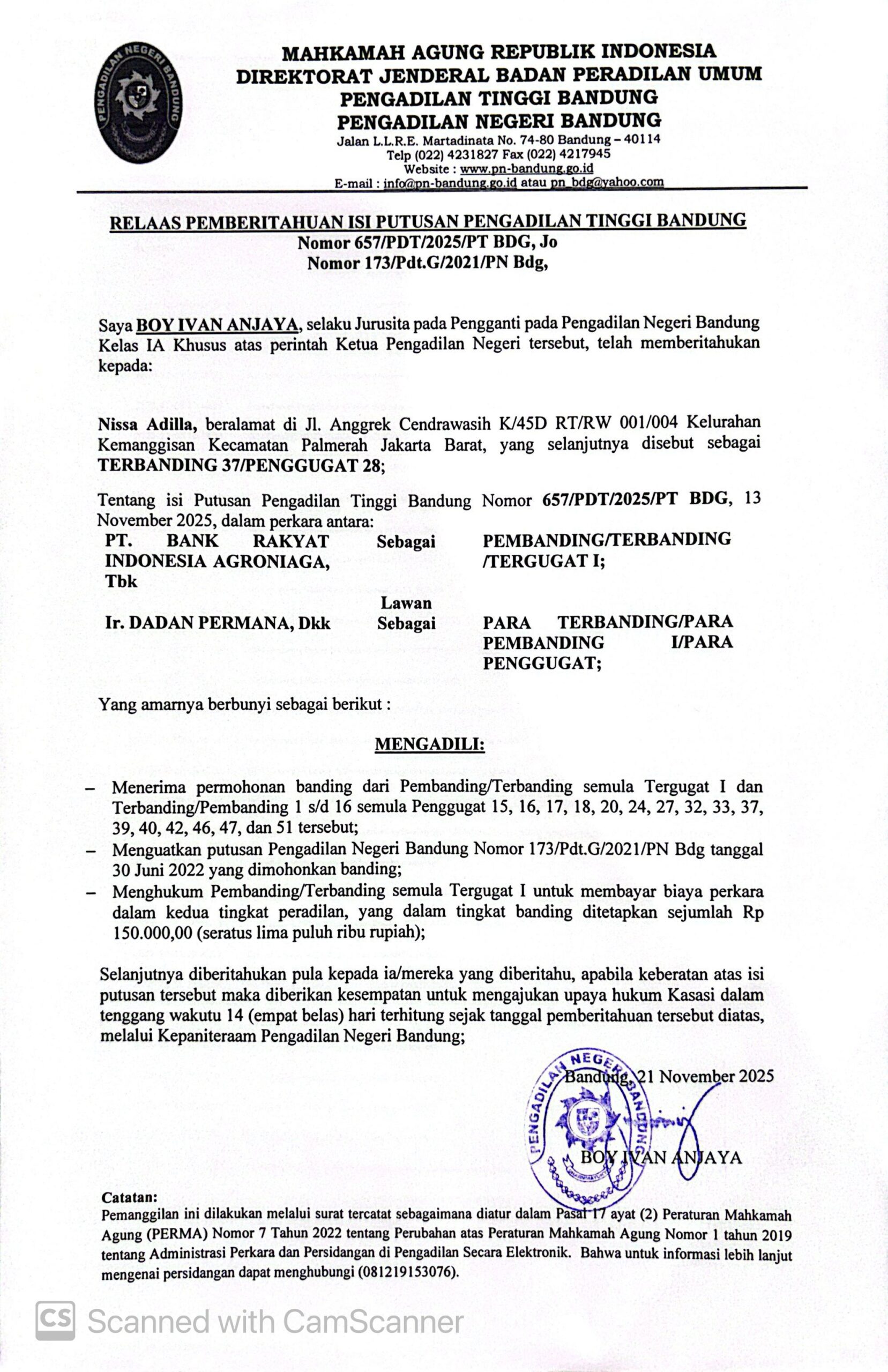 Nomor : 657/PDT/2025/PT BDG, Jo. Nomor 173/Pdt.G/2021/PN Bdg