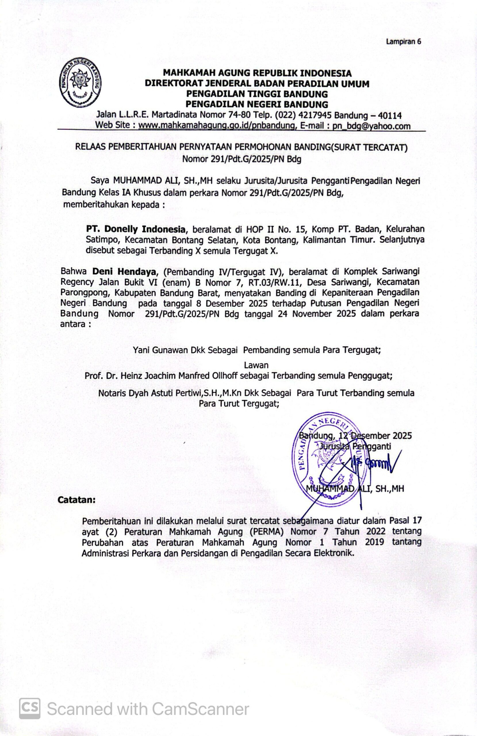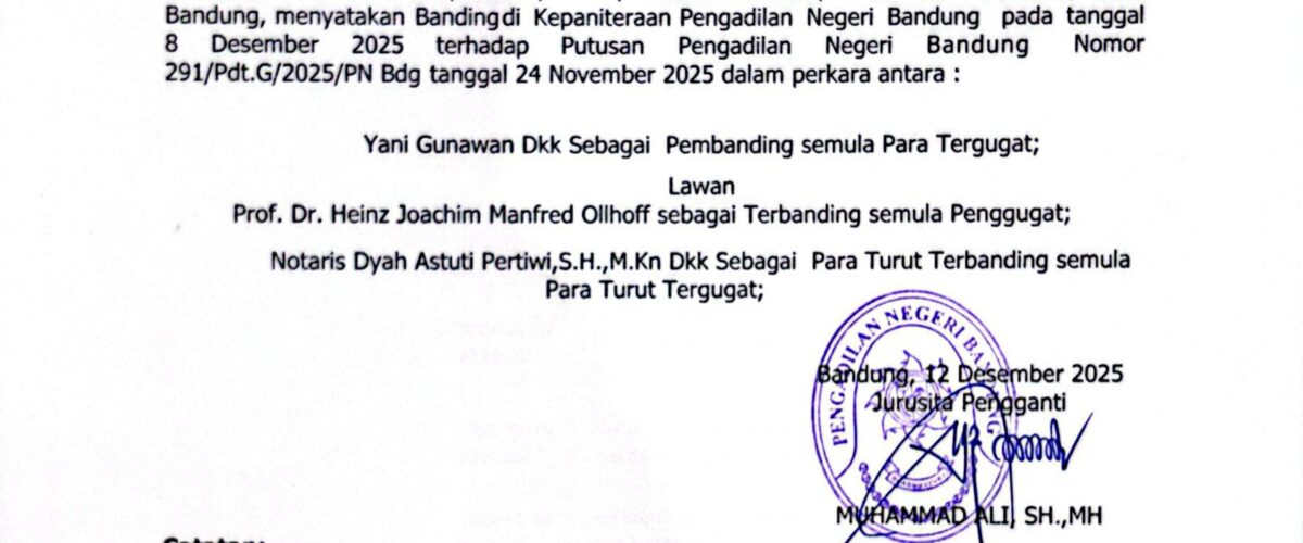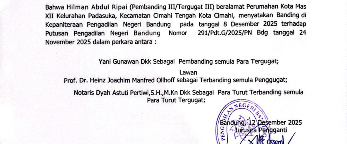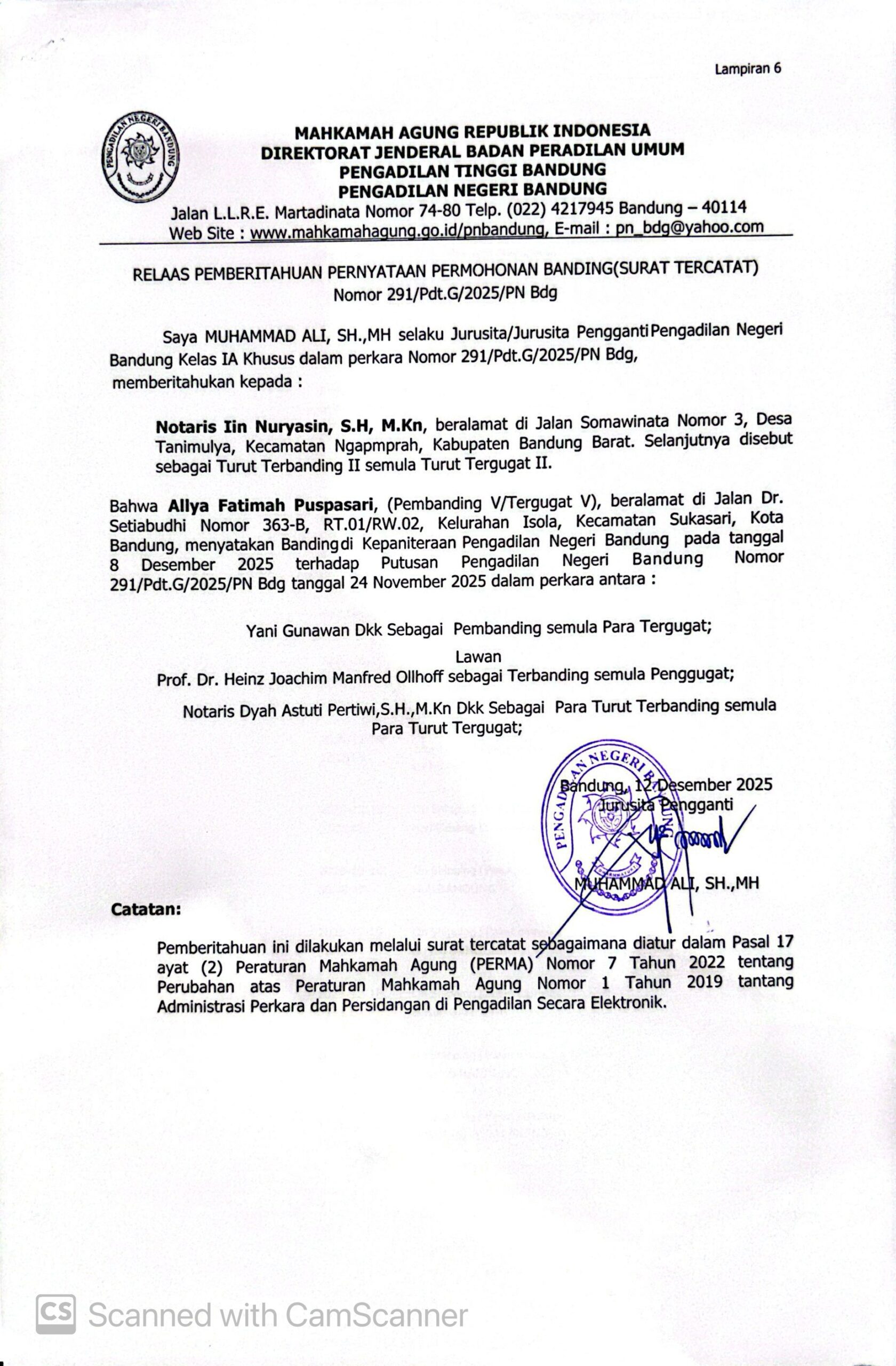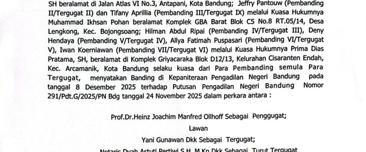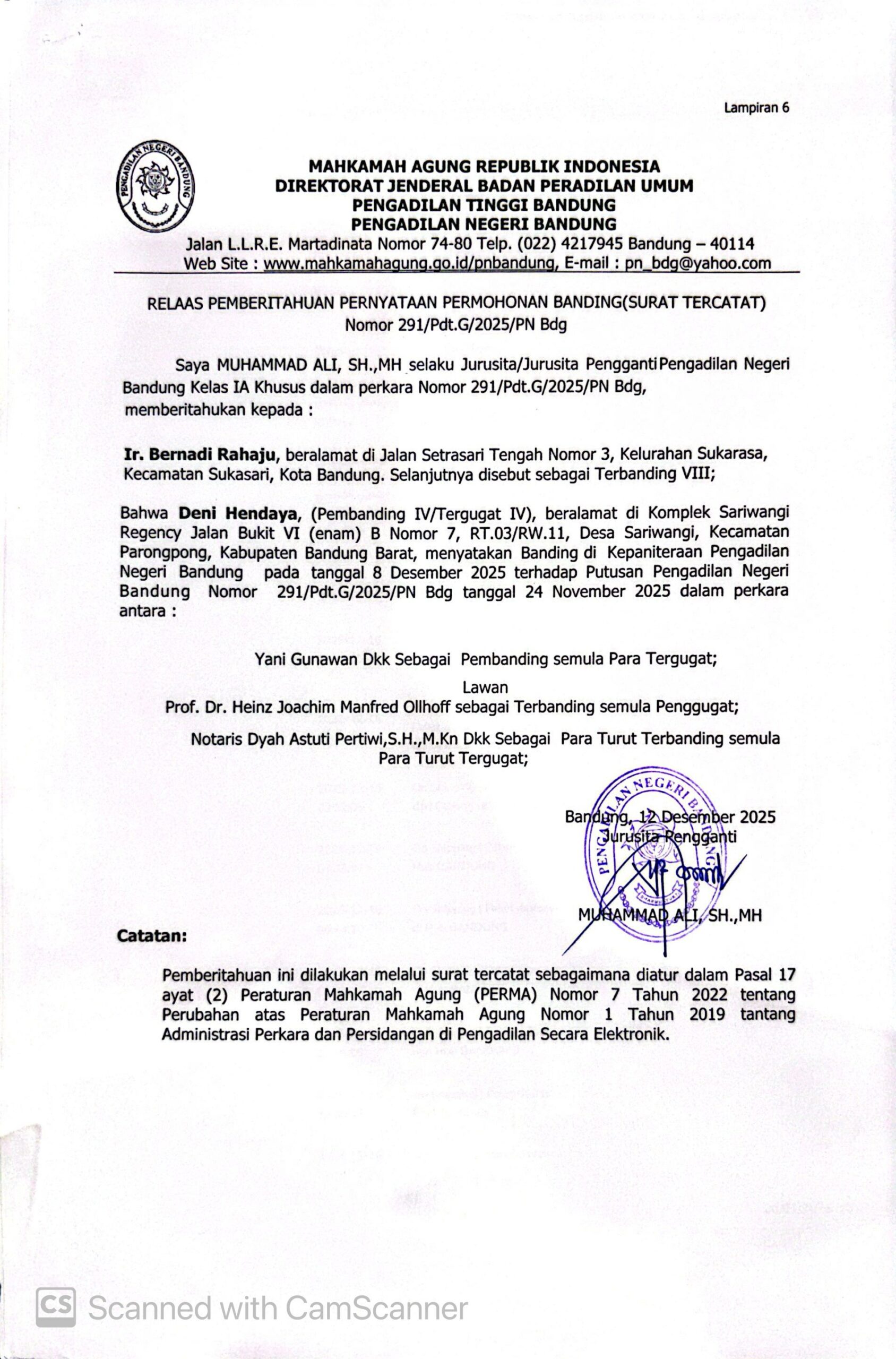 Relaas Pemberitahuan Pernyataan Permohonan Banding Nomor 291/Pdt.G/2025/PN Bdg Jo. 132/Pdt.B/2025/PN Bdg