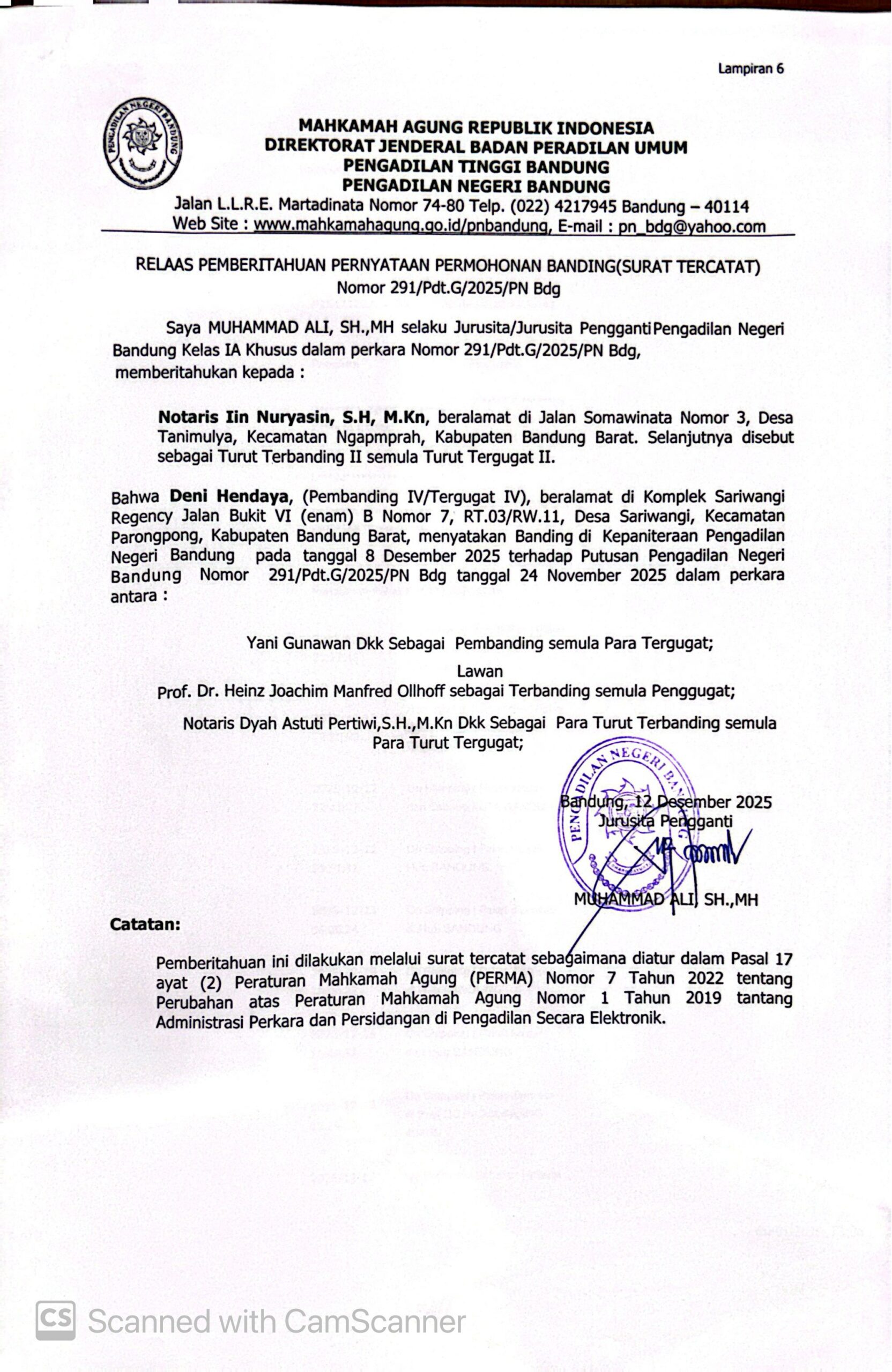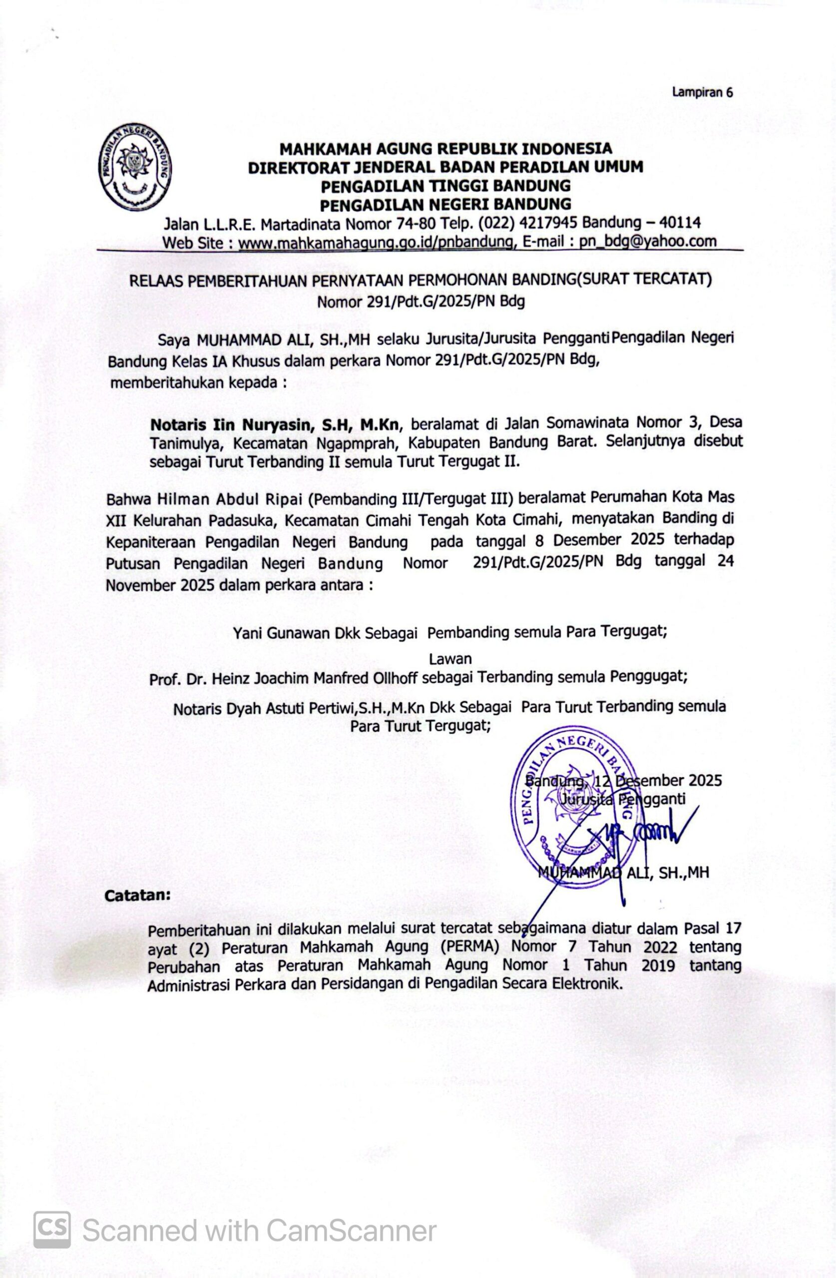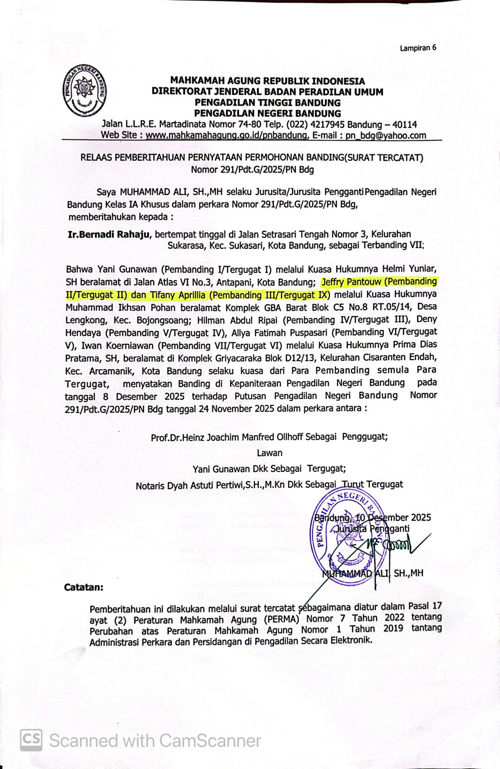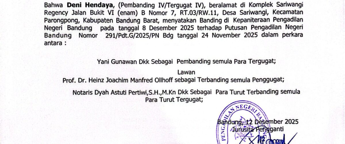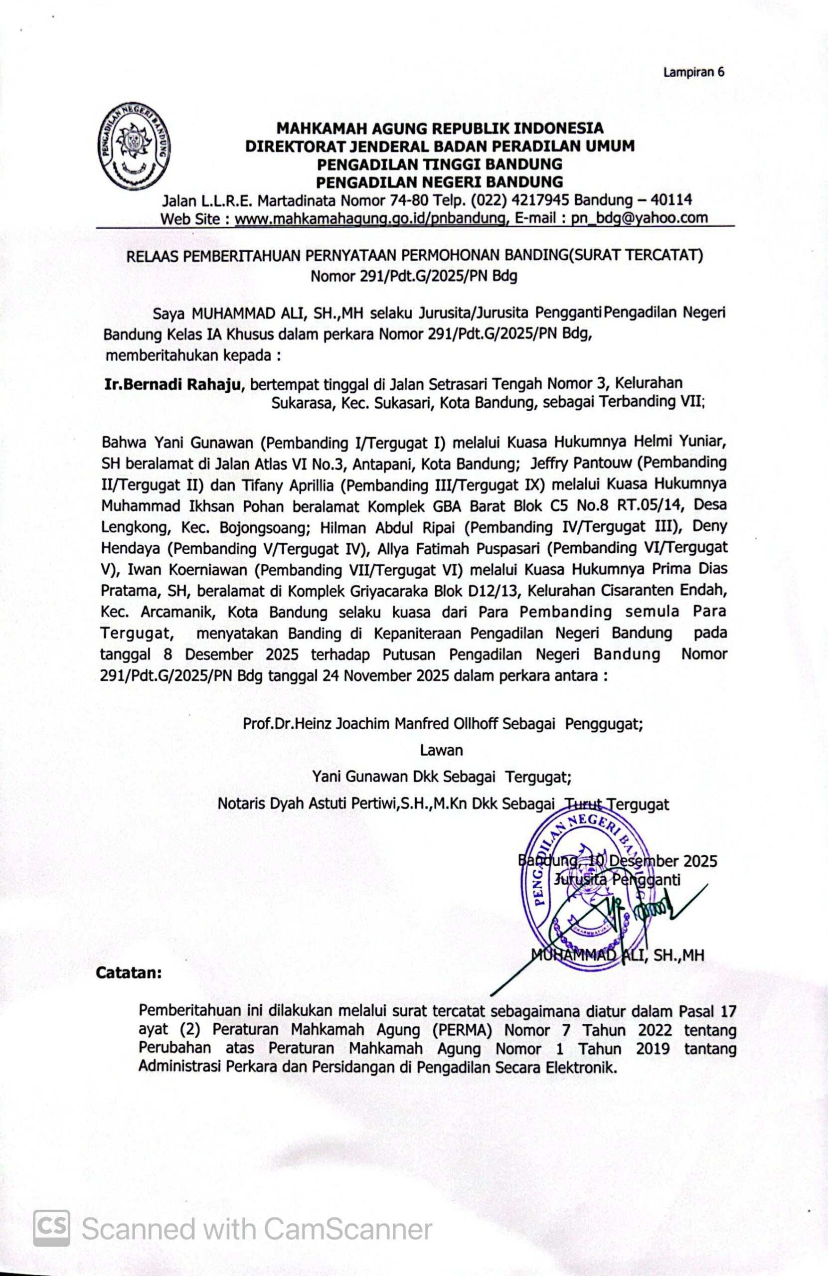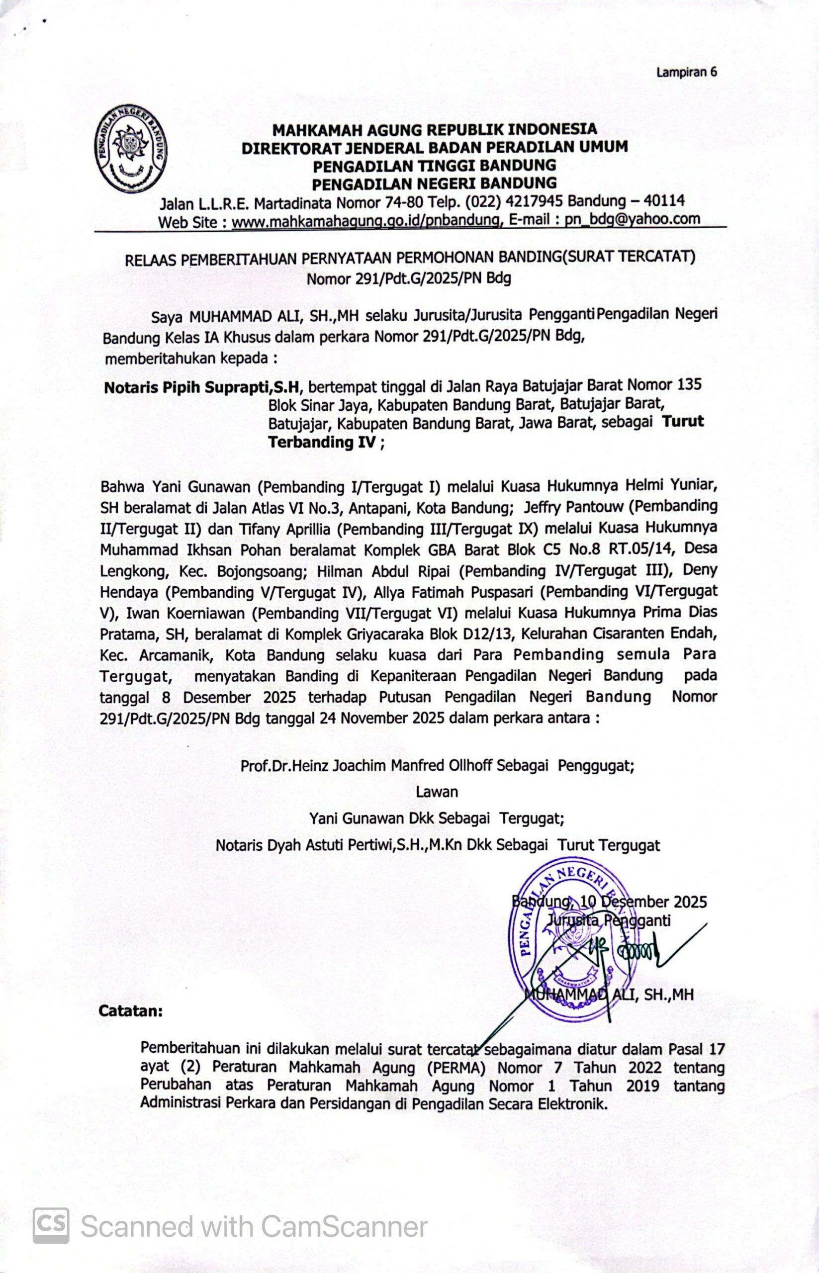 Relaas Pemberitahuan Pernyataan Permohonan Banding Nomor 291/Pdt.G/2025/PN Bdg Jo. 132/Pdt.B/2025/PN Bdg