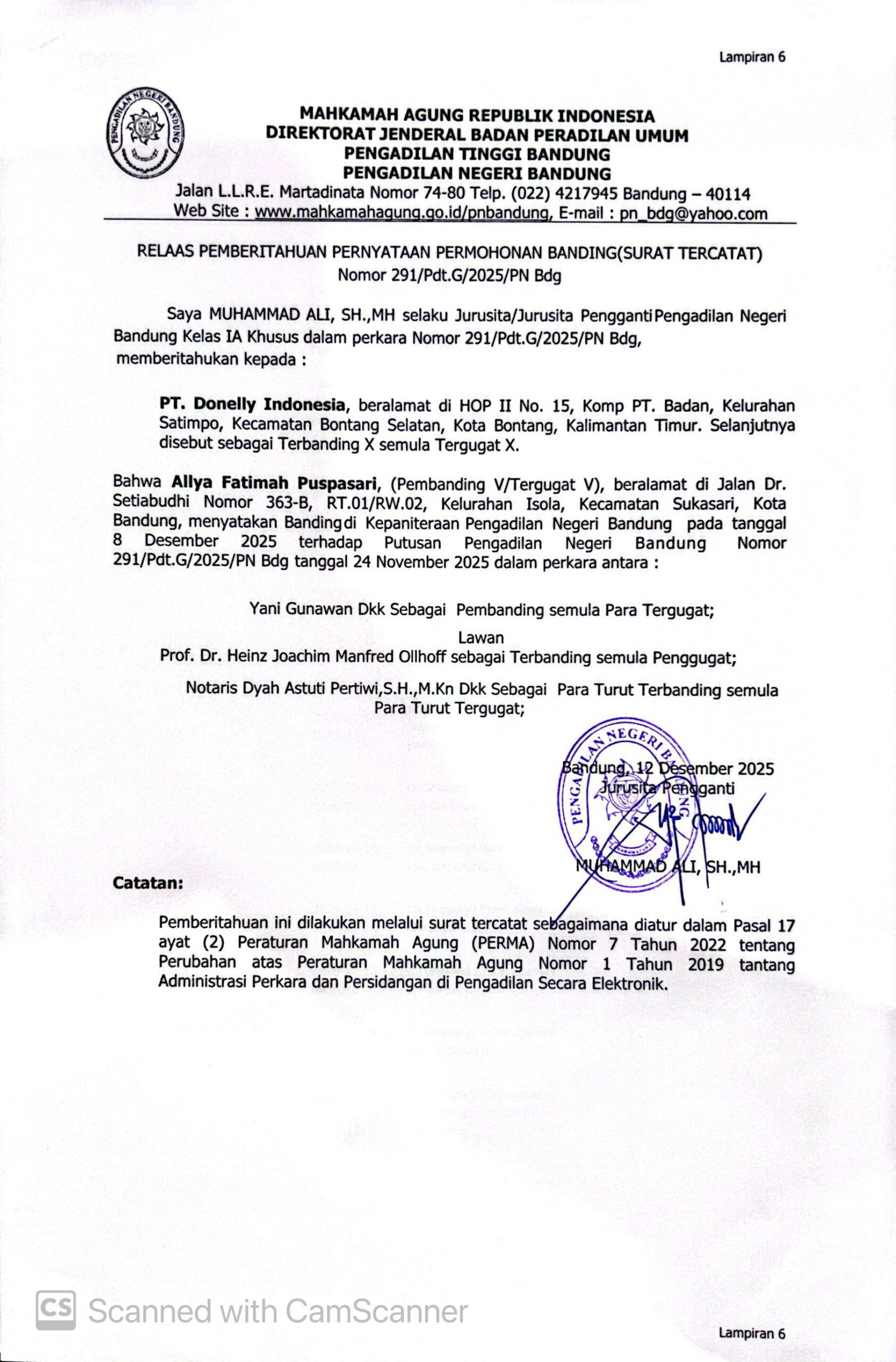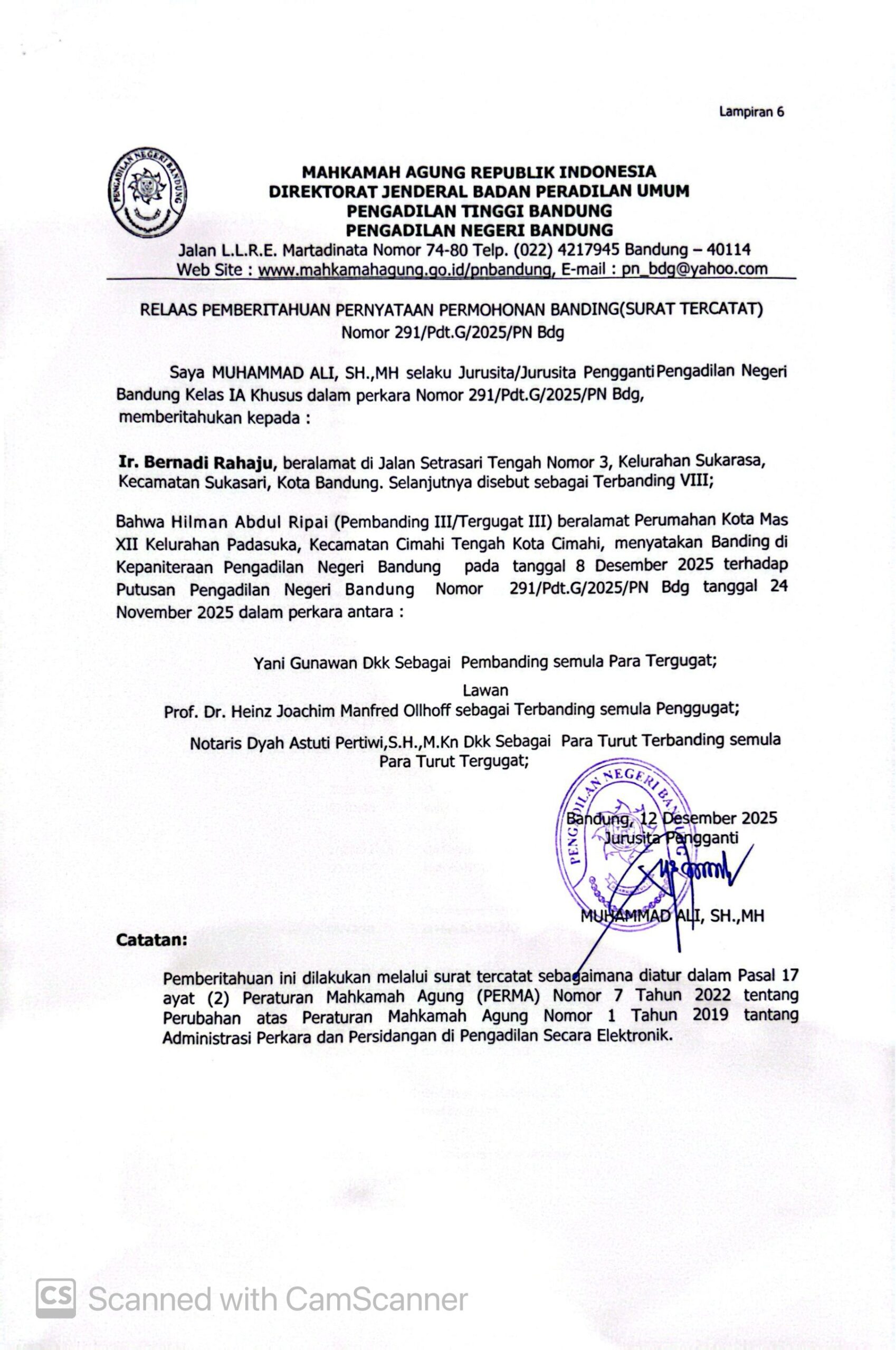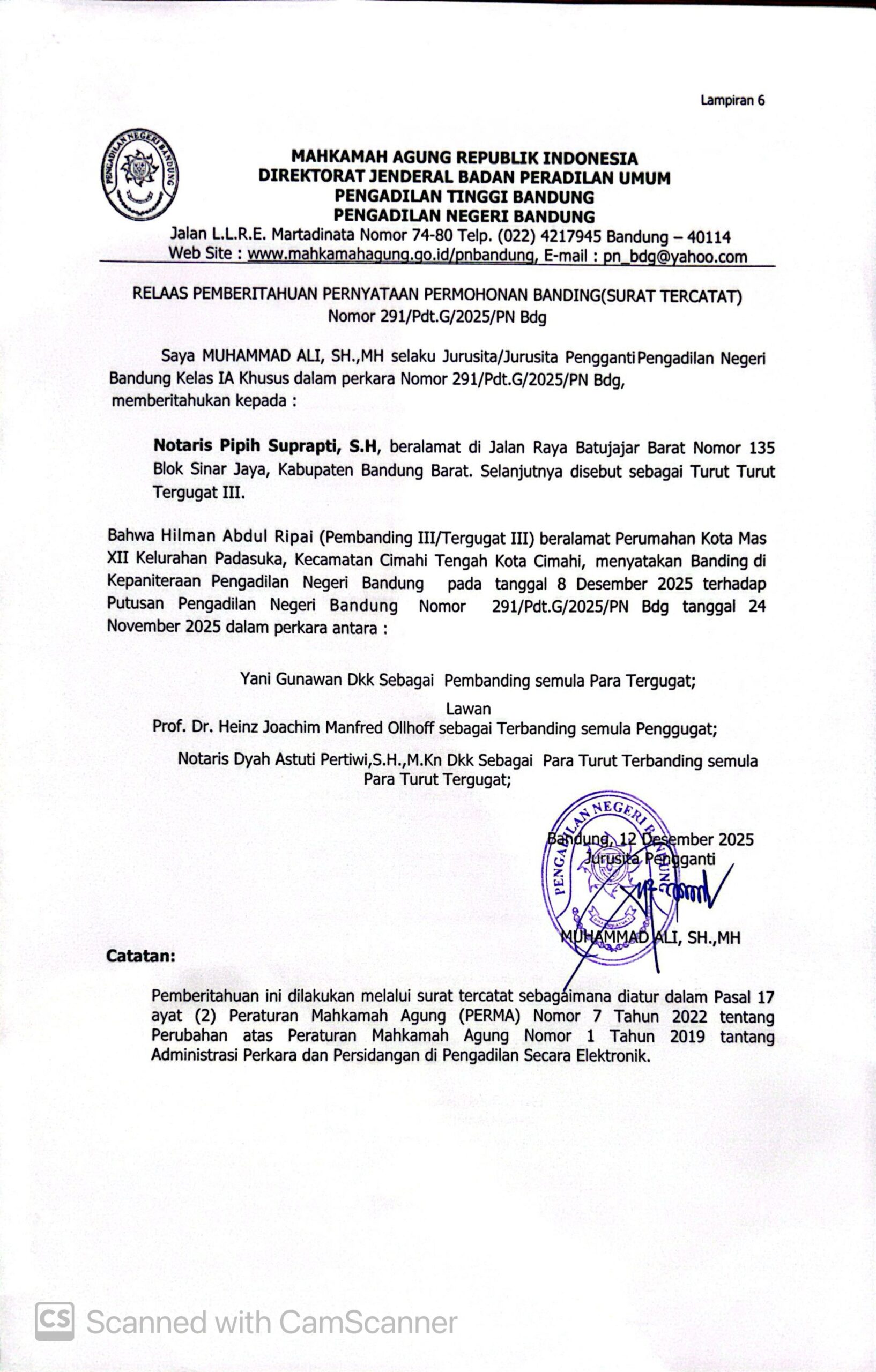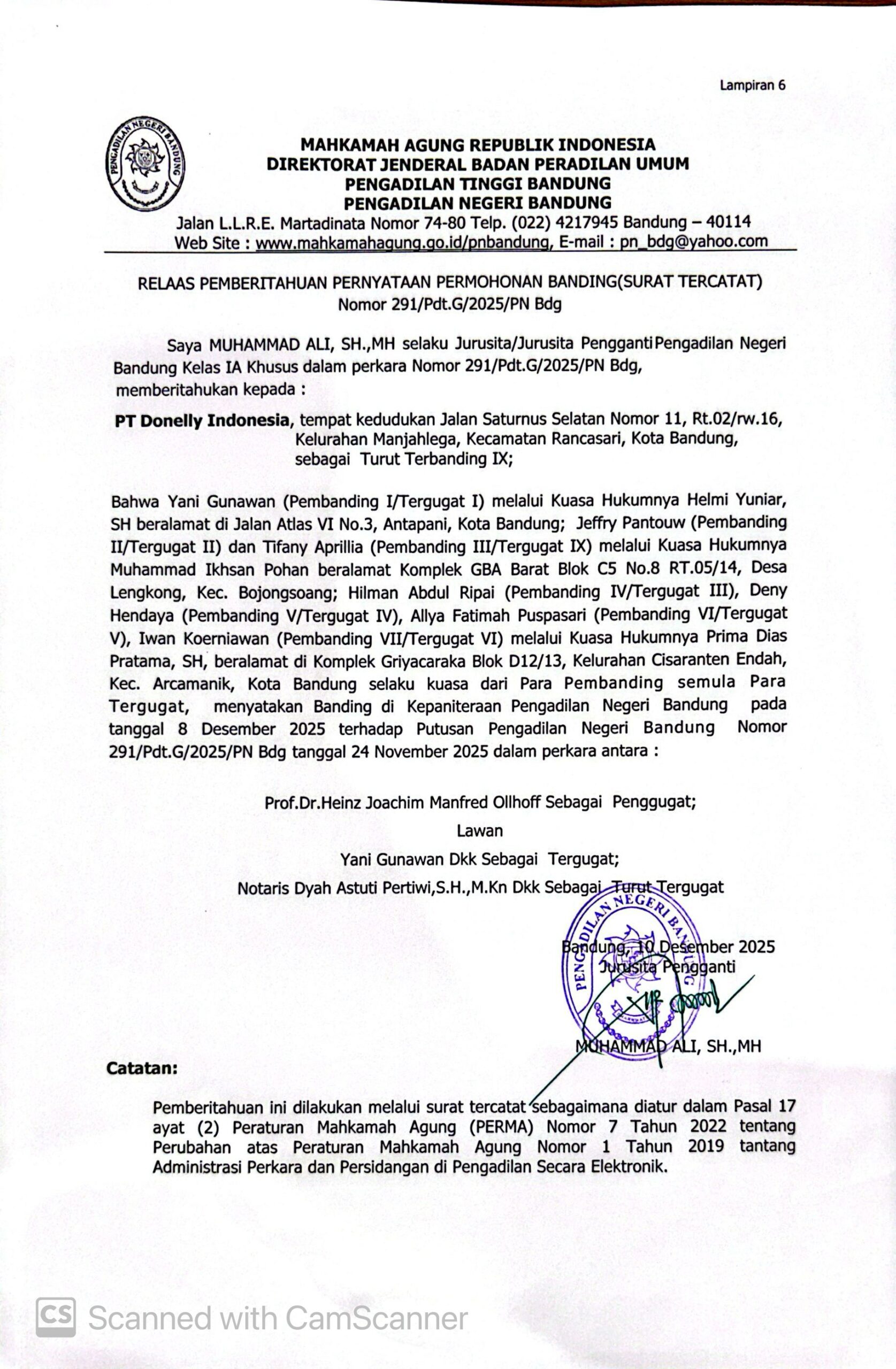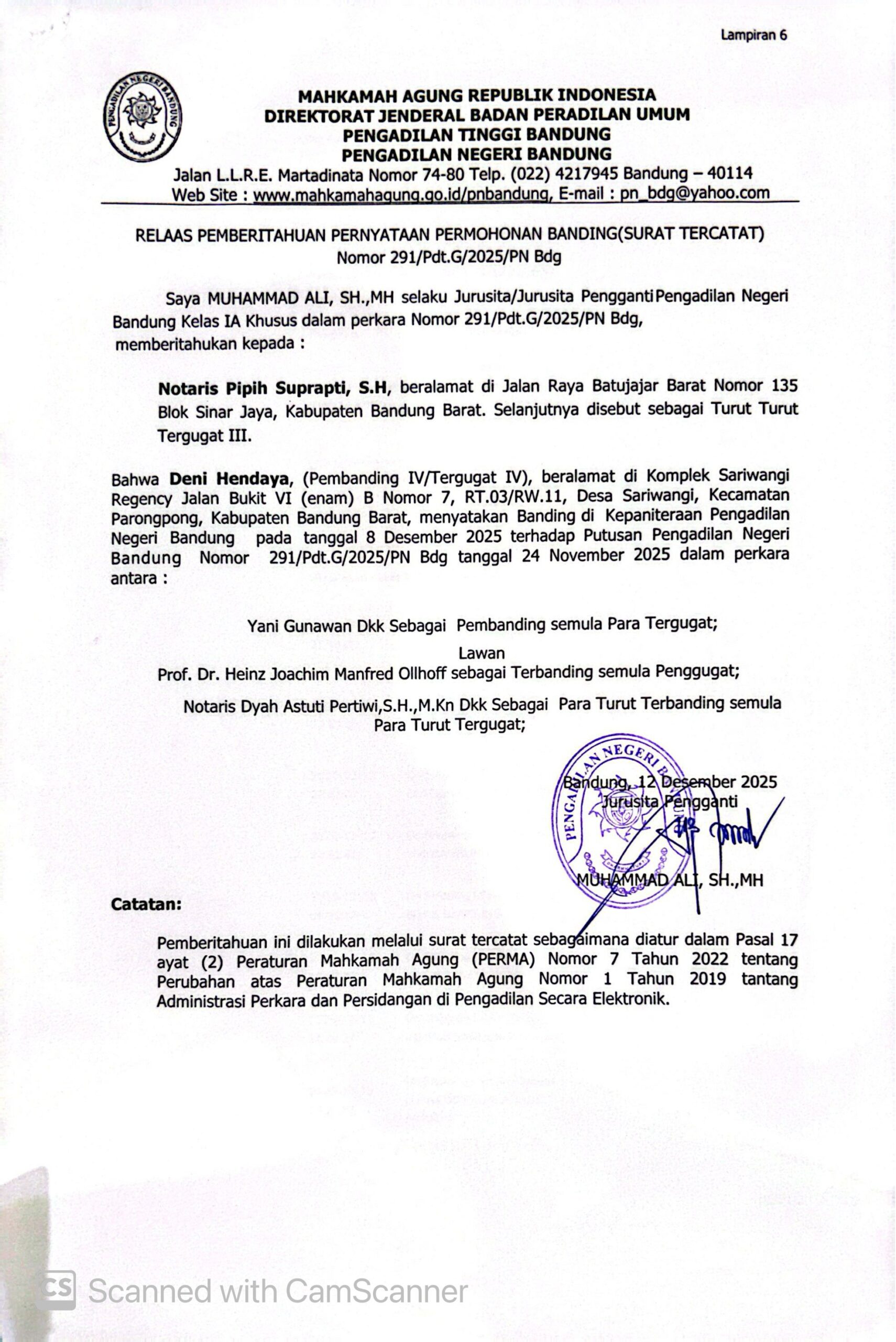 Relaas Pemberitahuan Pernyataan Permohonan Banding Nomor 291/Pdt.G/2025/PN Bdg Jo. 132/Pdt.B/2025/PN Bdg