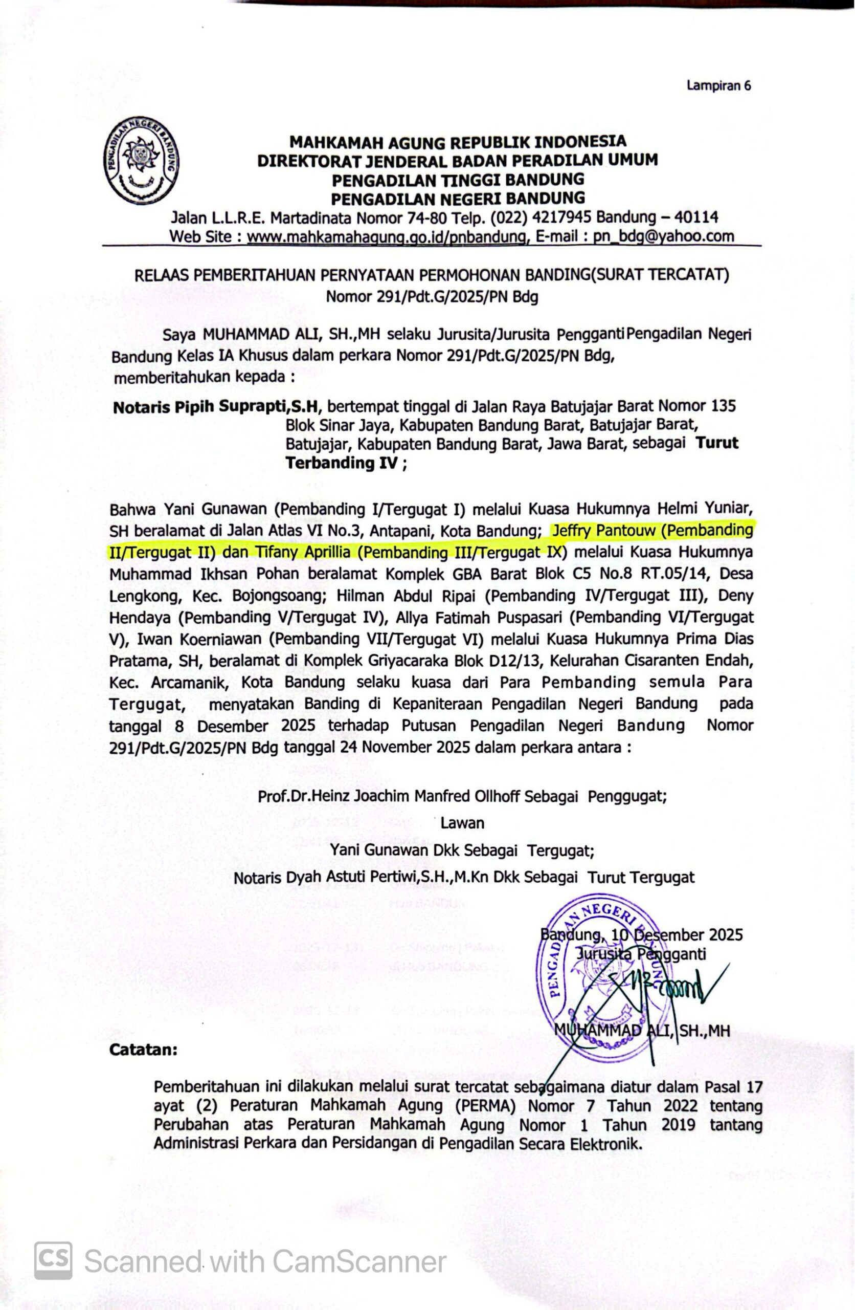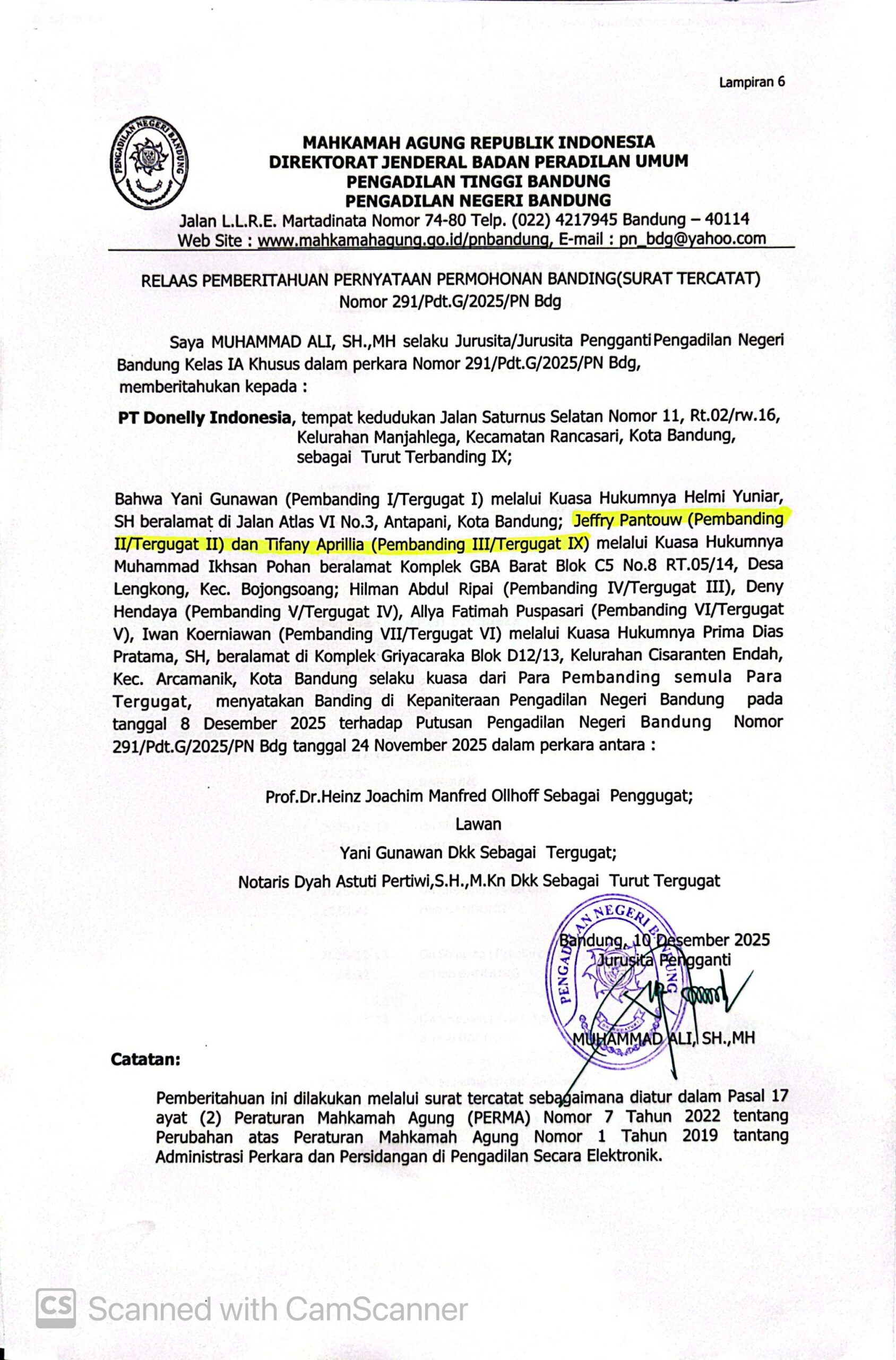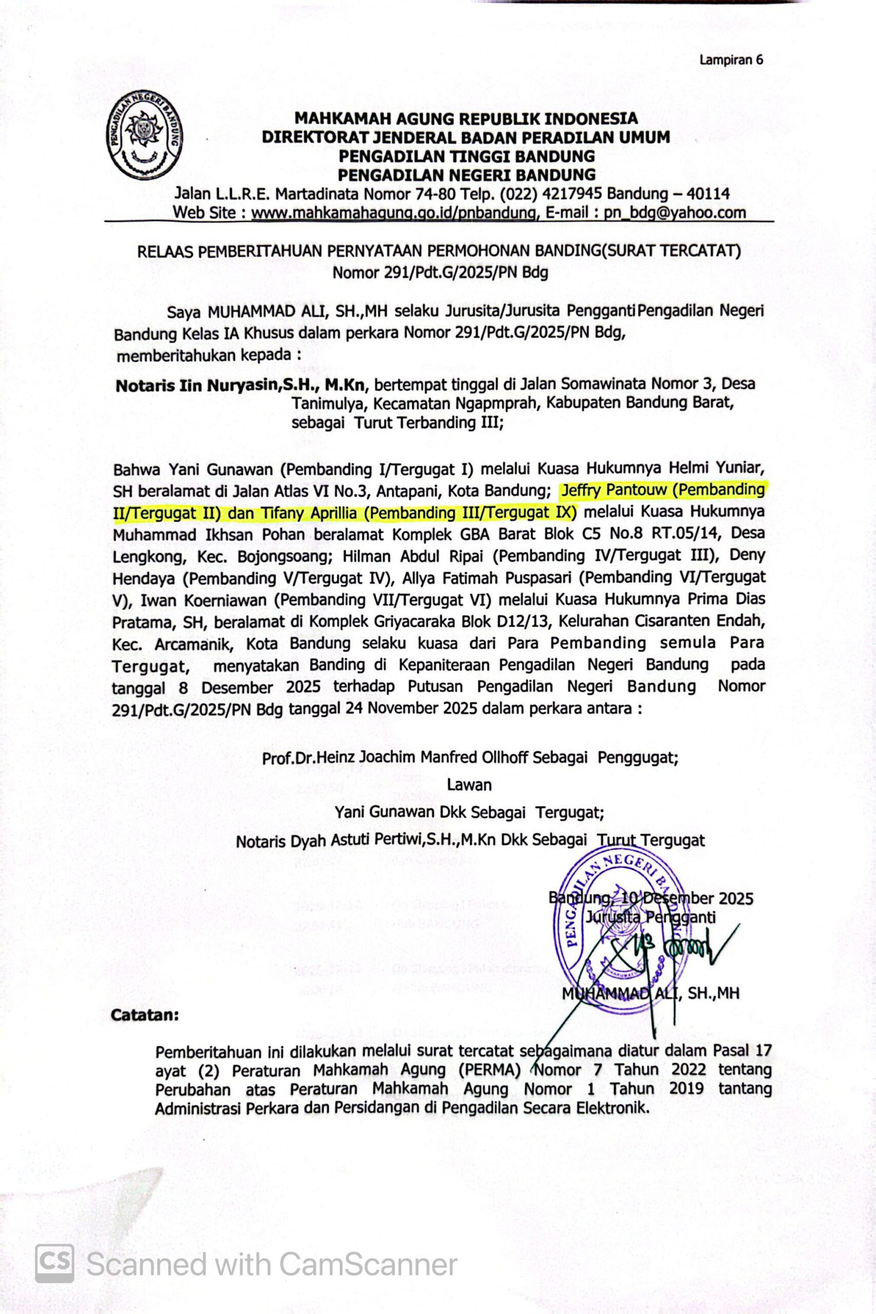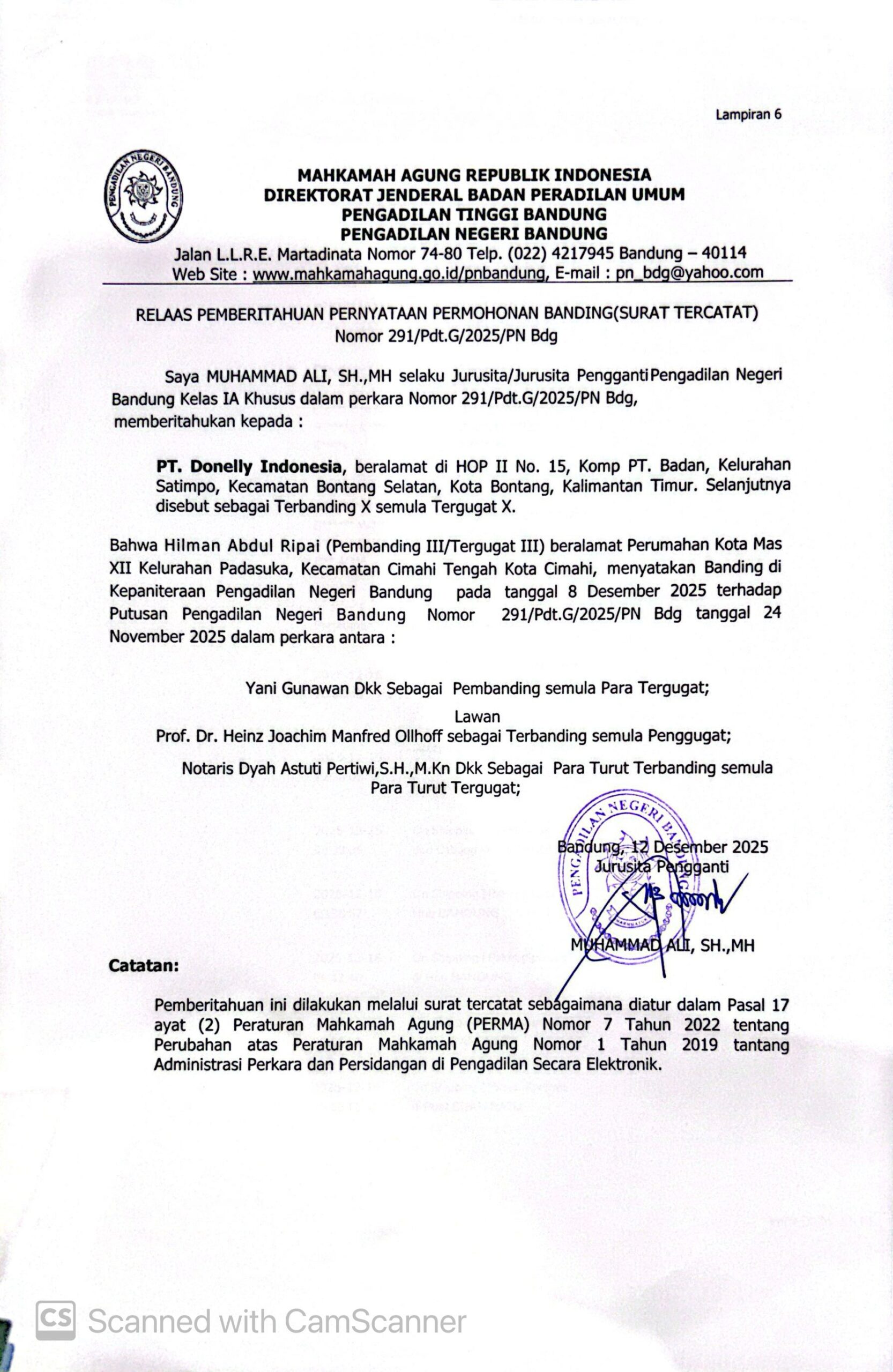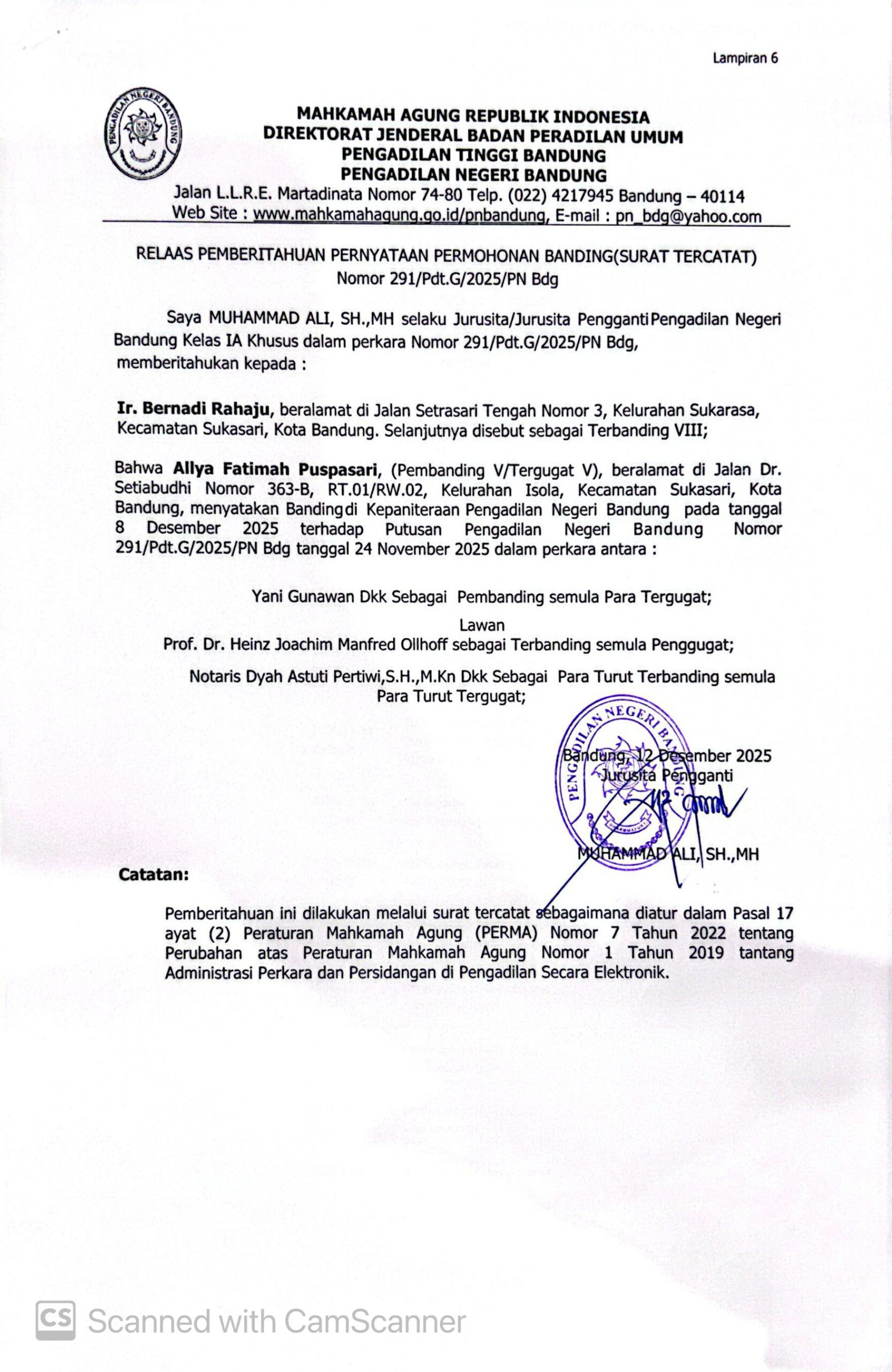 Relaas Pemberitahuan Pernyataan Permohonan Banding Nomor 291/Pdt.G/2025/PN Bdg Jo. 132/Pdt.B/2025/PN Bdg
