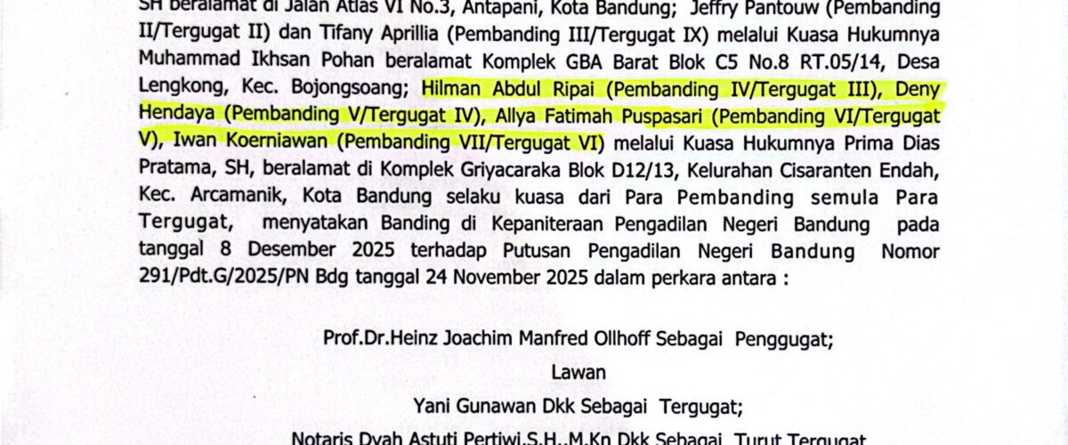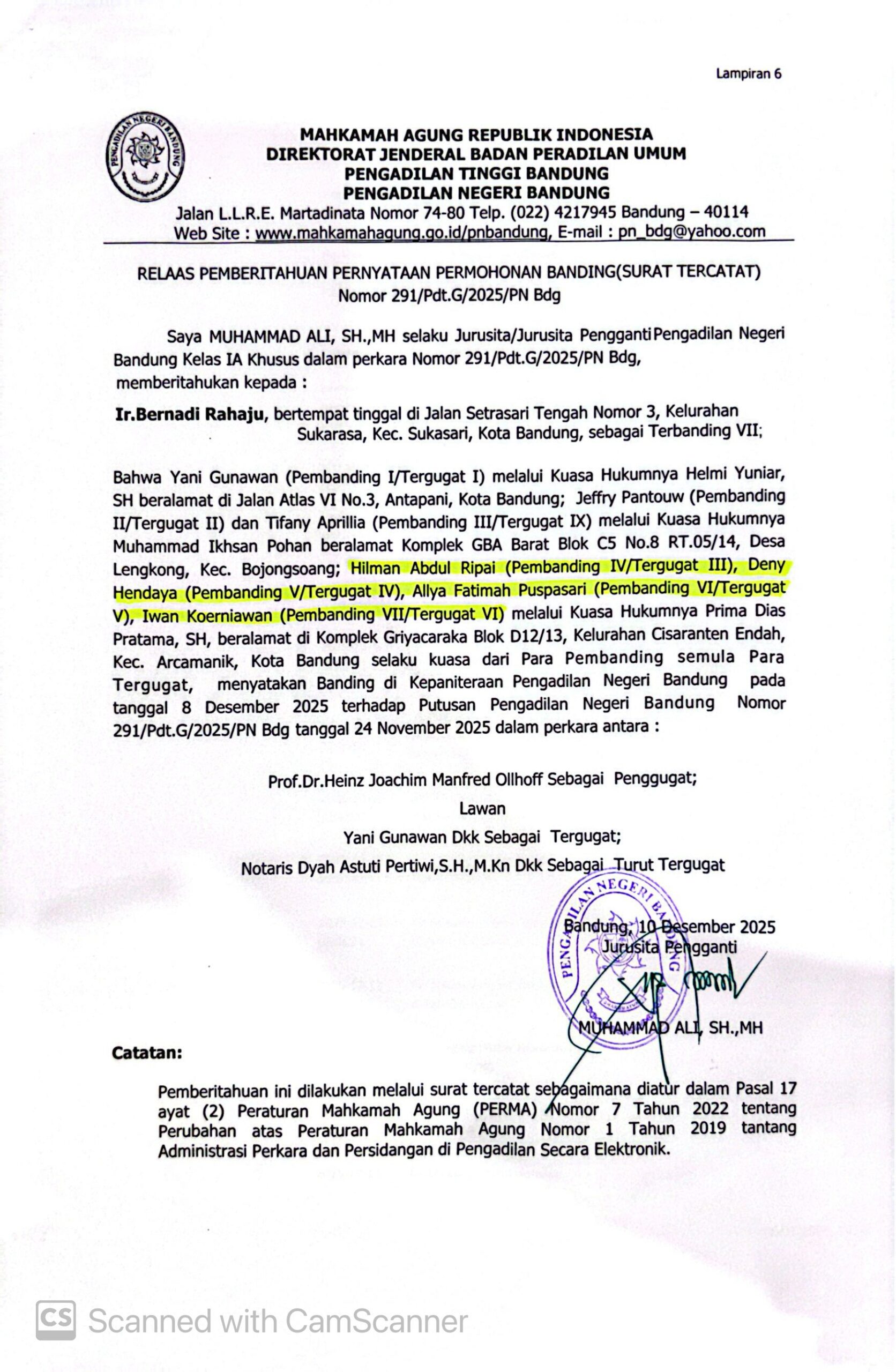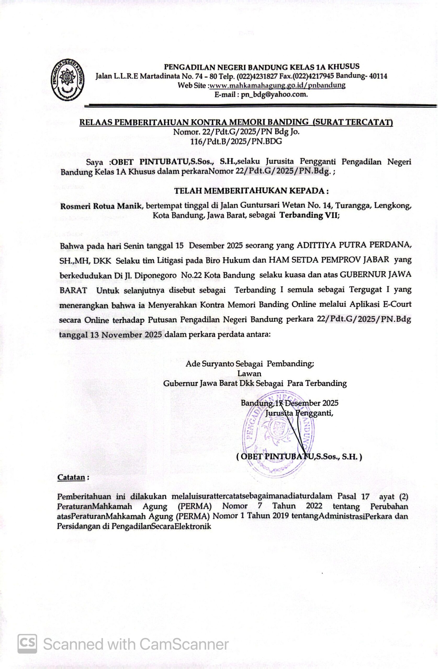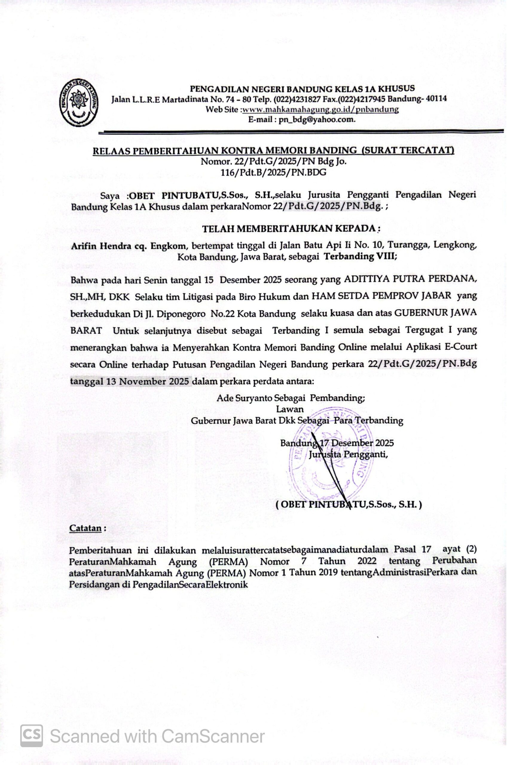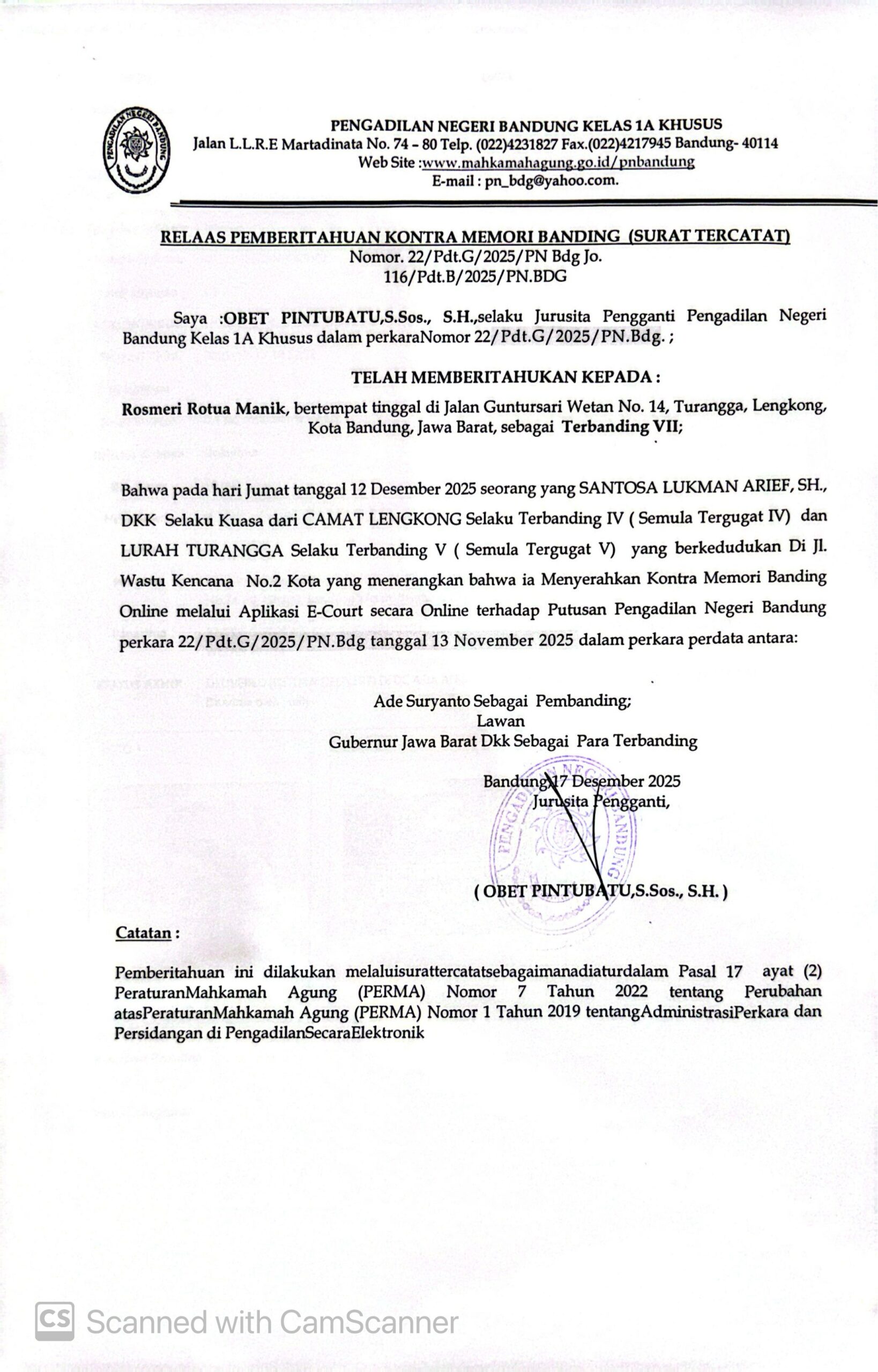 Relaas Pemberitahuan Pernyataan Permohonan Banding Nomor 291/Pdt.G/2025/PN Bdg Jo. 132/Pdt.B/2025/PN Bdg