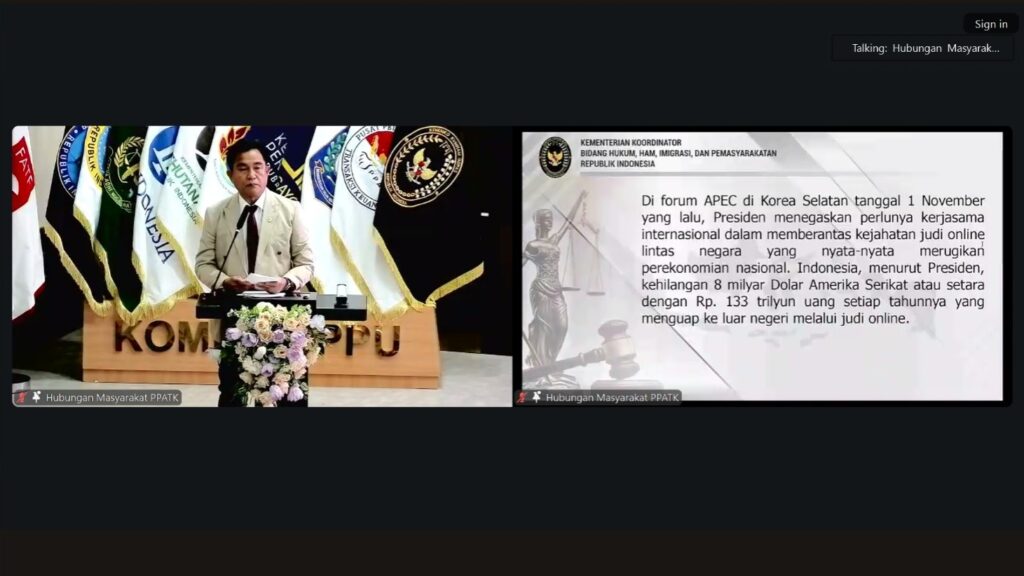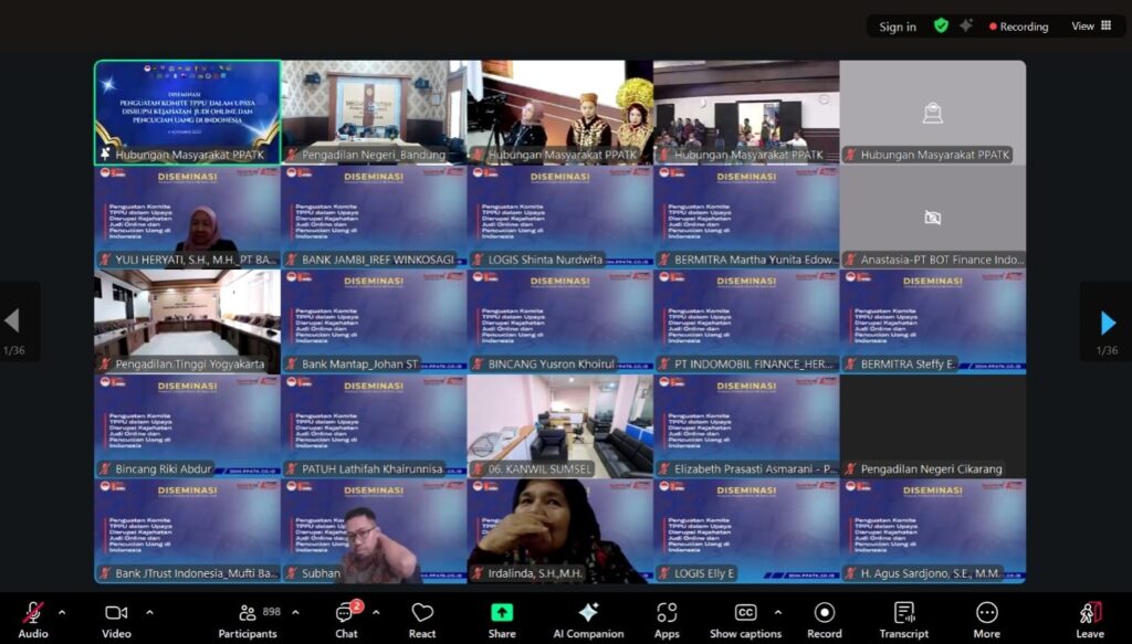 Dalam rangka mendukung upaya pencegahan dan pemberantasan tindak pidana pencucian uang (TPPU) serta penguatan tata kelola sektor strategis nasional, Pusat Pelaporan dan Analisis Transaksi Keuangan (PPATK) Pengadilan Negeri Bandung mengikuti kegiatan Diseminasi “Penguatan Komite TPPU dalam Mencegah dan Memberantas Tindak Pidana Pencucian Uang terkait Perjudian Online” melalui virtual zoom kegiatan tersebut diikuti oleh perwakilan 2 hakim.