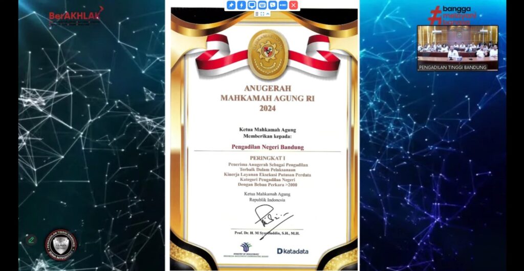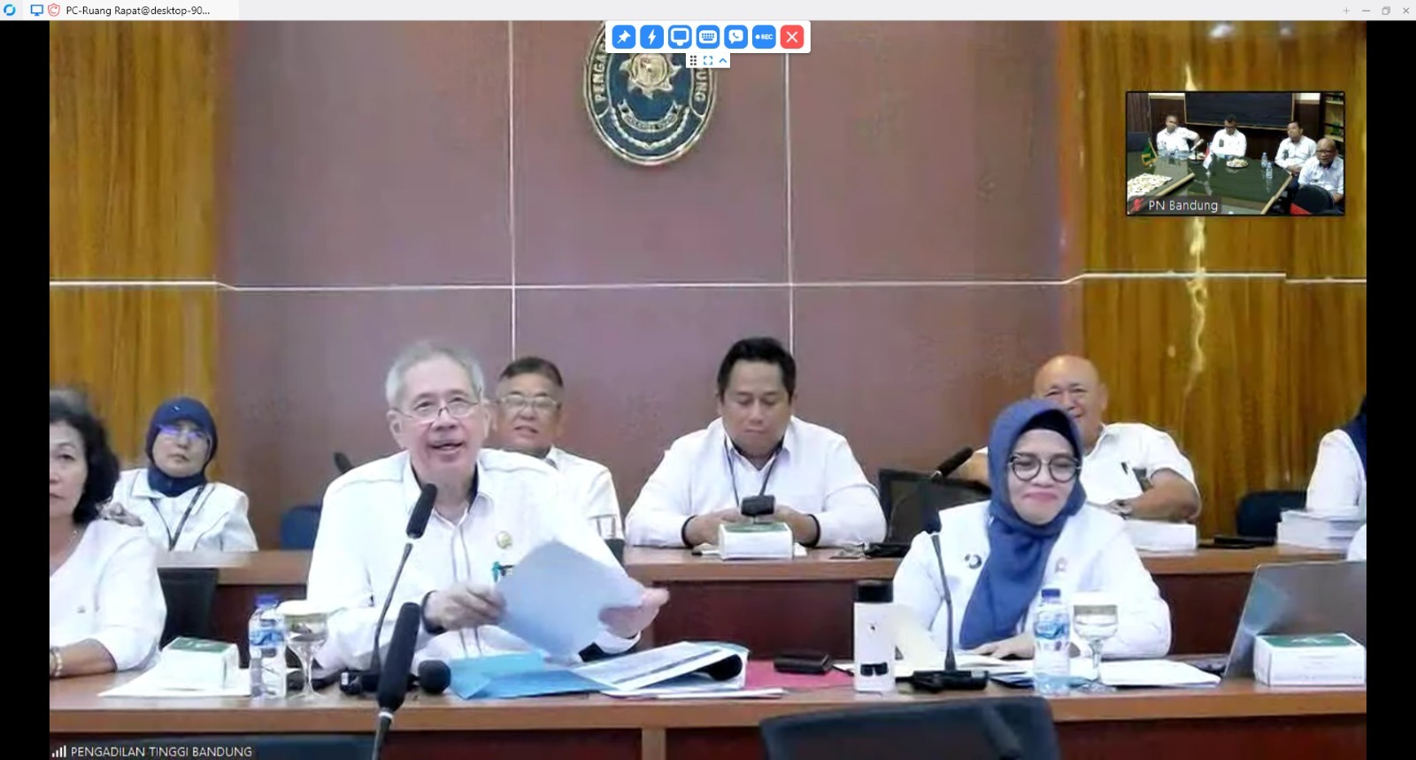 (Bandung, 26 Agustus 2024), Bertempat di Ruang Rapat Pengadilan Negeri Bandung telah dilakukan Pembinaan oleh Ketua Pengadilan Tinggi Bandung yang dilakukan secara virtual melalui Zoom Meeting yang diikuti oleh seluruh Ketua Pengadilan Negeri, Wakil Ketua, Panitera, Sekretaris, Para Panitera Muda dan Kepala Sub Bagian Se-Wilayah Pengadilan Tinggi Bandung.