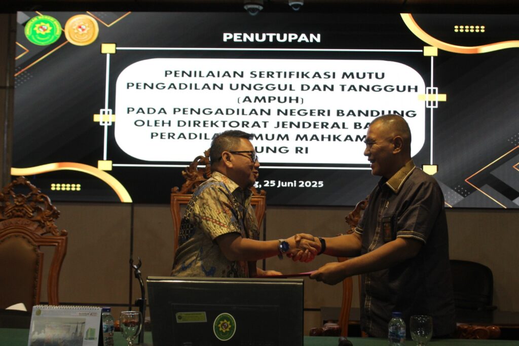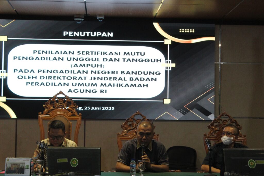 Kegiatan Penilaian Sertifikasi Mutu Pengadilan Unggul dan Tangguh (AMPUH) di Pengadilan Negeri Bandung resmi ditutup oleh oleh Sekretaris Direktorat Jenderal Badan Peradilan Umum (Ditjen Badilum) Bapak Kurnia Arry Soelaksono, S.E., S.H., M.Hum. dalam sebuah acara penutupan yang berlangsung khidmat dan penuh semangat di ruang Sidang Utama Pengadilan Negeri Bandung.