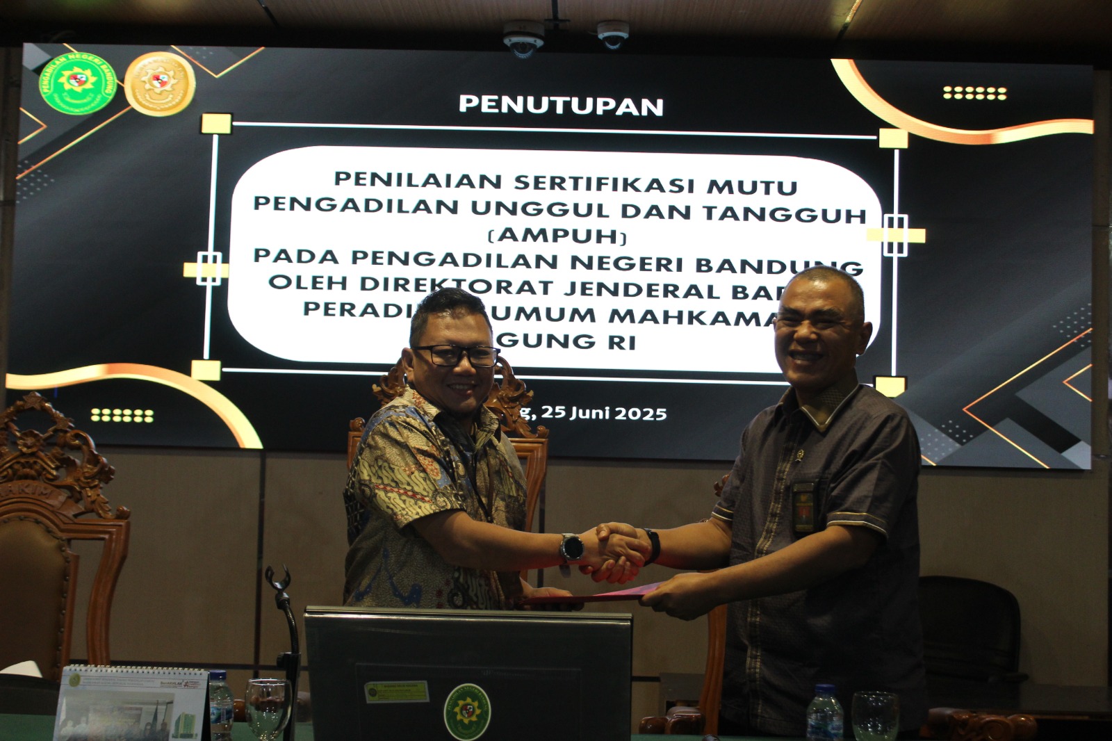 Penutupan kegiatan ditandai dengan penyerahan dokumen hasil penilaian secara simbolis dari Tim Penilai kepada Ketua Pengadilan Negeri Bandung, serta foto bersama seluruh jajaran dan tim penilai. Acara kemudian ditutup dengan doa dan ramah tamah.