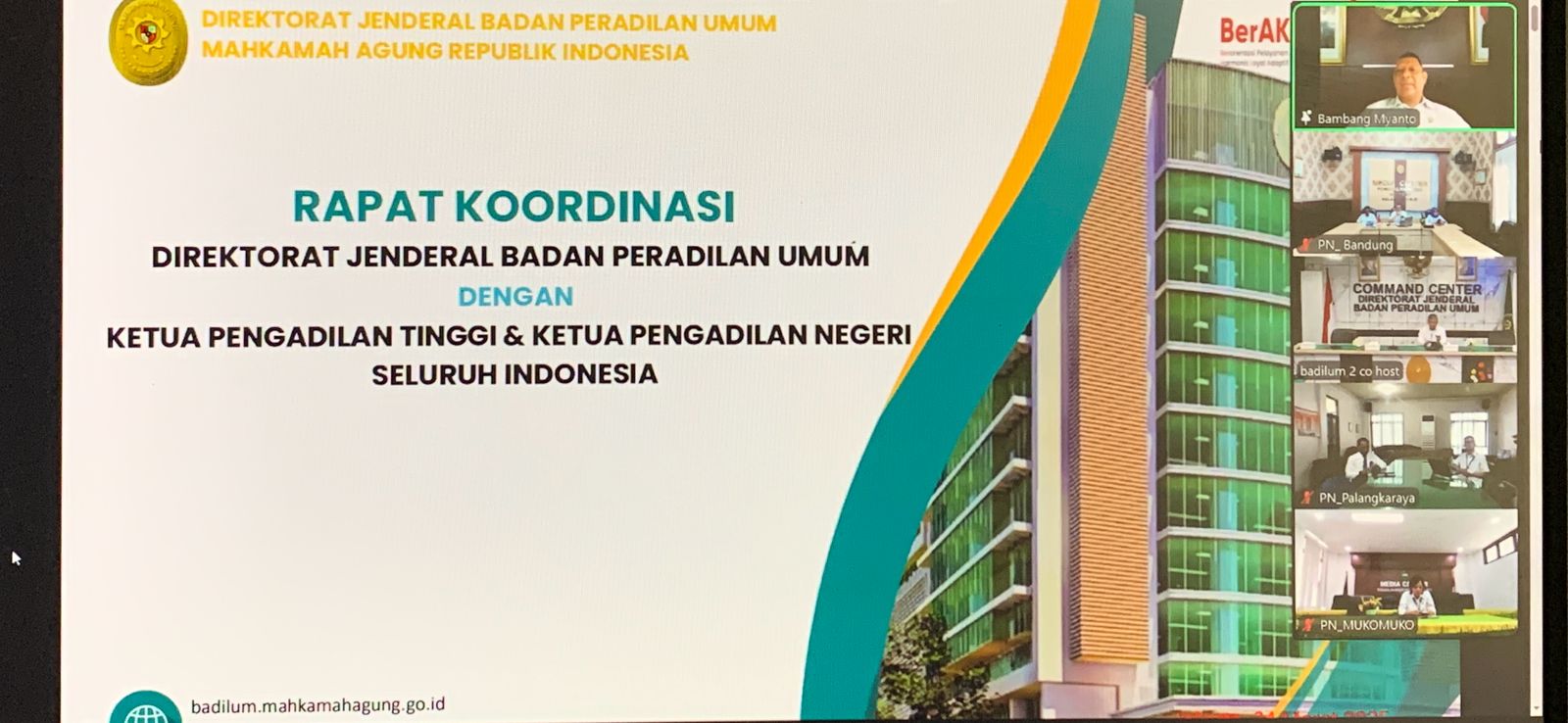 Bertempat di media centre, Pengadilan Negeri Bandung mengikuti rapat koordinasi dengan para Ketua Pengadilan Tinggi (KPT) dan ketua Pengadilan Negeri (KPN) ini sebagai tindak lanjut arahan dari pimpinan Mahkamah Agung RI. Materi dalam rapat koordinasi ini disampaikan secara online oleh Direktur Jenderal Badan Peradilan Umum H. Bambang Myanto, S.H., M.H.