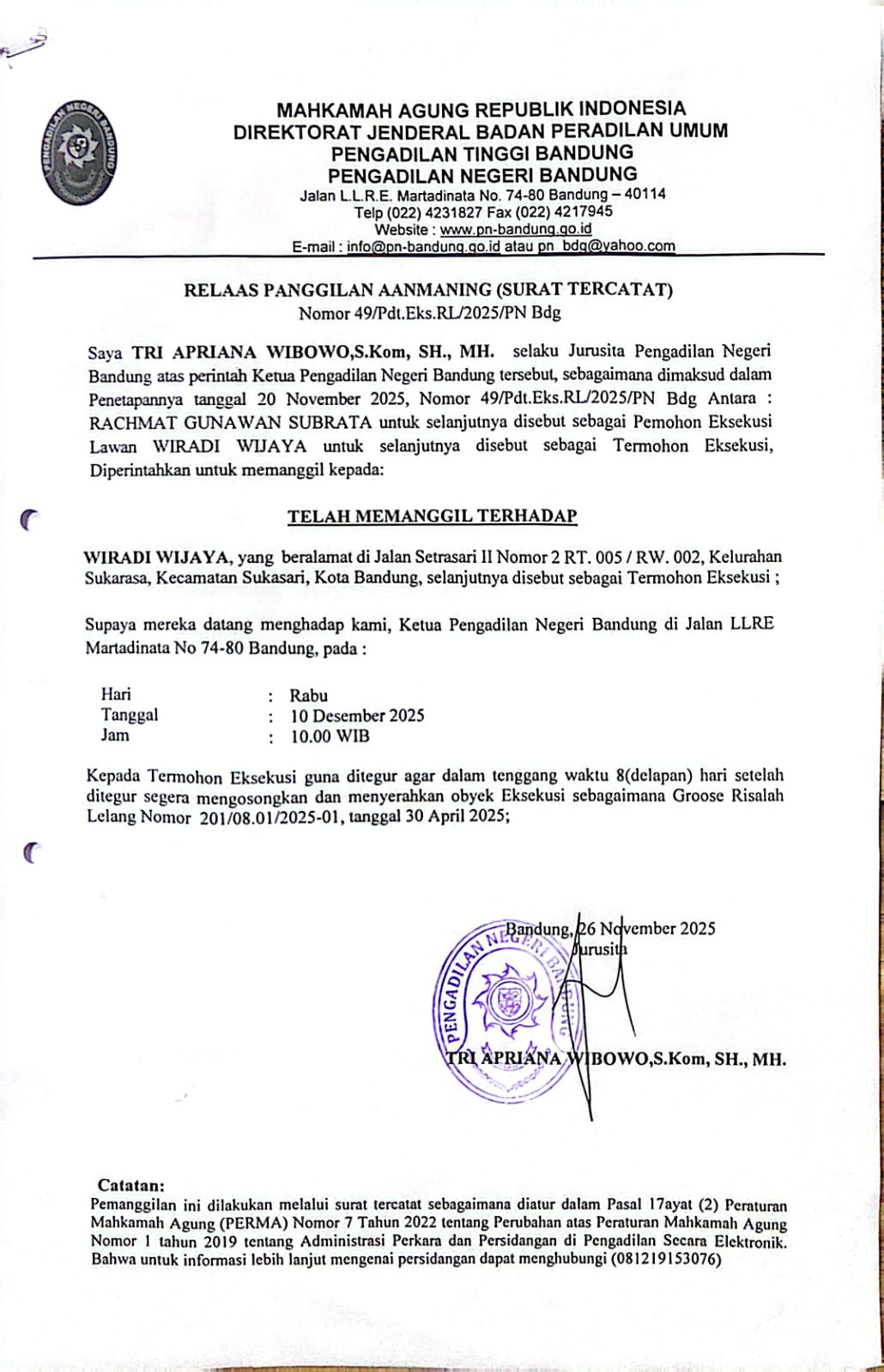 Relaas Panggilan Aanmaning Nomor 49/Pdt.Eks.RL/2025/PN Bdg