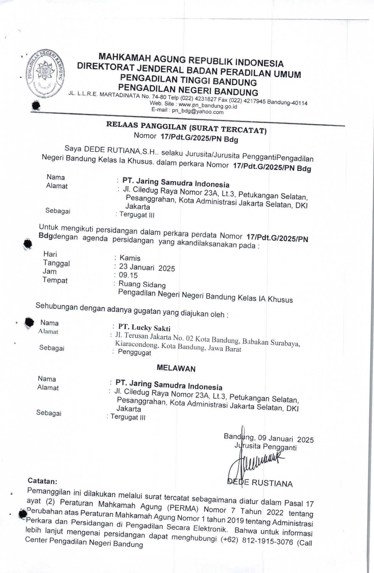 Relaas Panggilan Nomor 17/Pdt.G/2025/PN Bdg