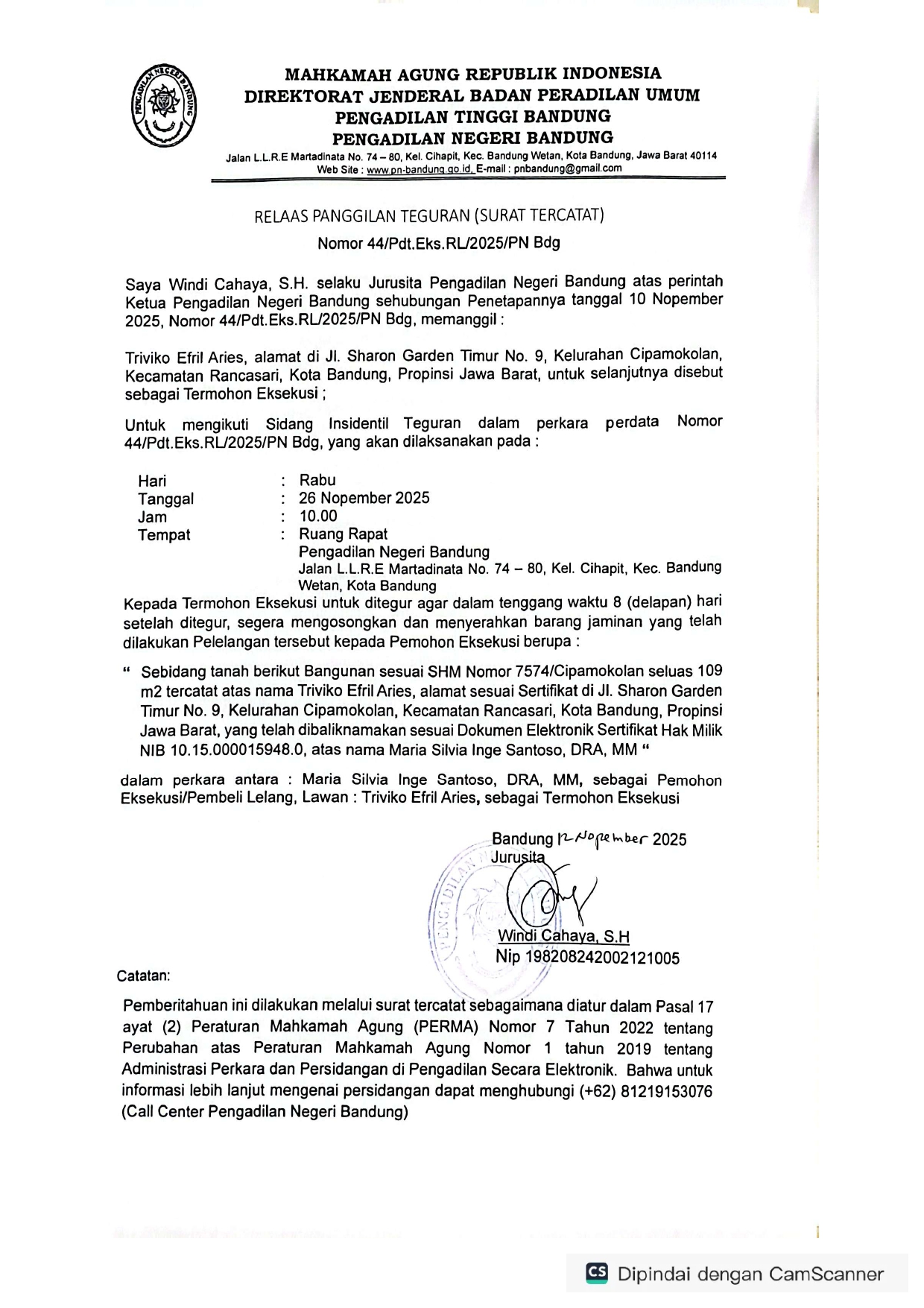 Relaas Panggilan Teguran Nomor 44/Pdt.Eks.RL/2025/PN Bdg