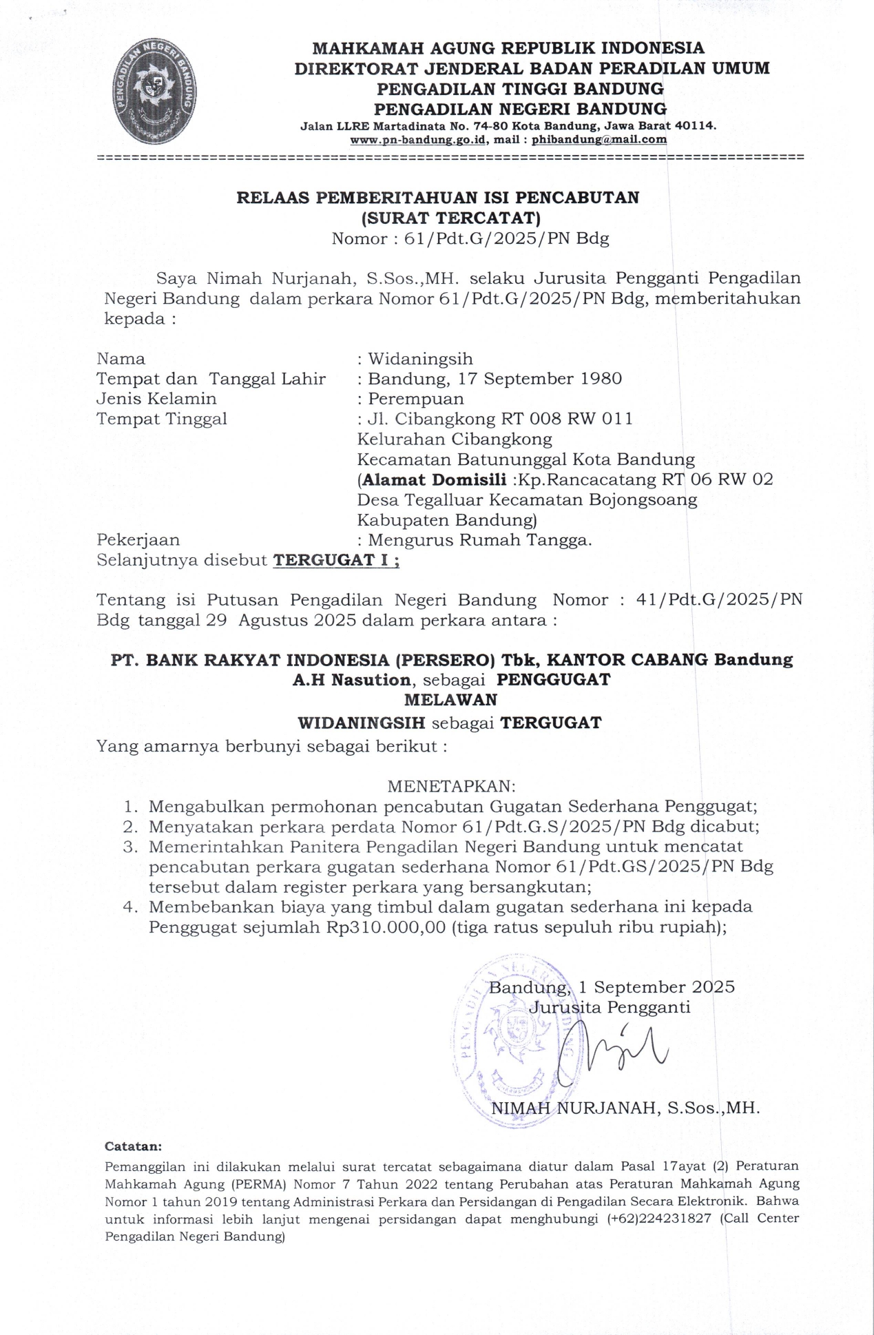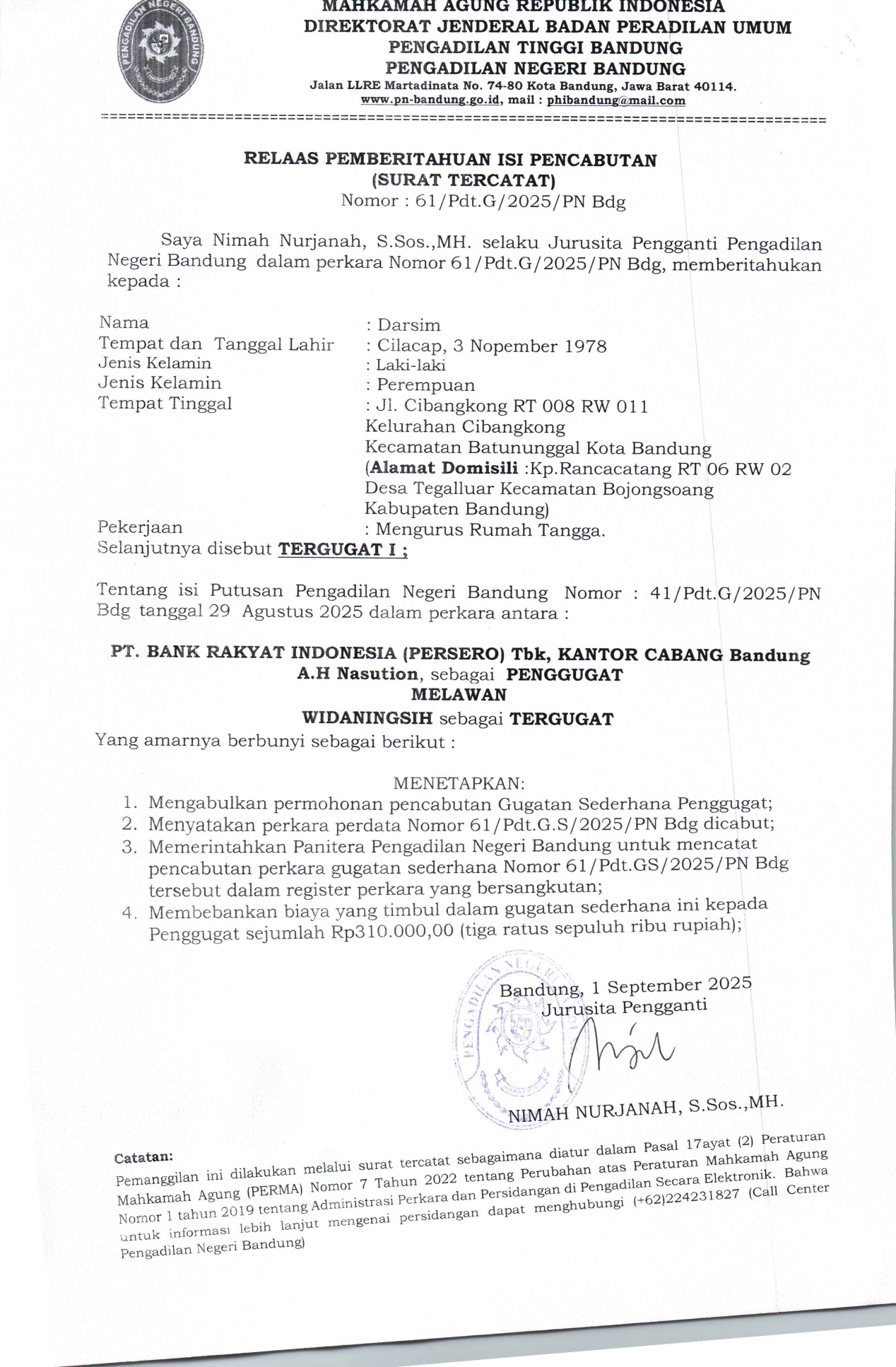 Relaas Pemberitahuan Isi Pencabutan (Surat Tercatat) Nomor : 61/Pdt.G/2025/PN Bdg