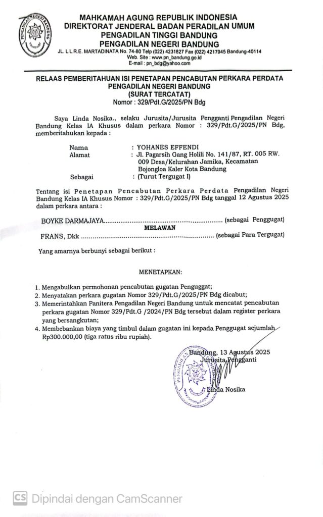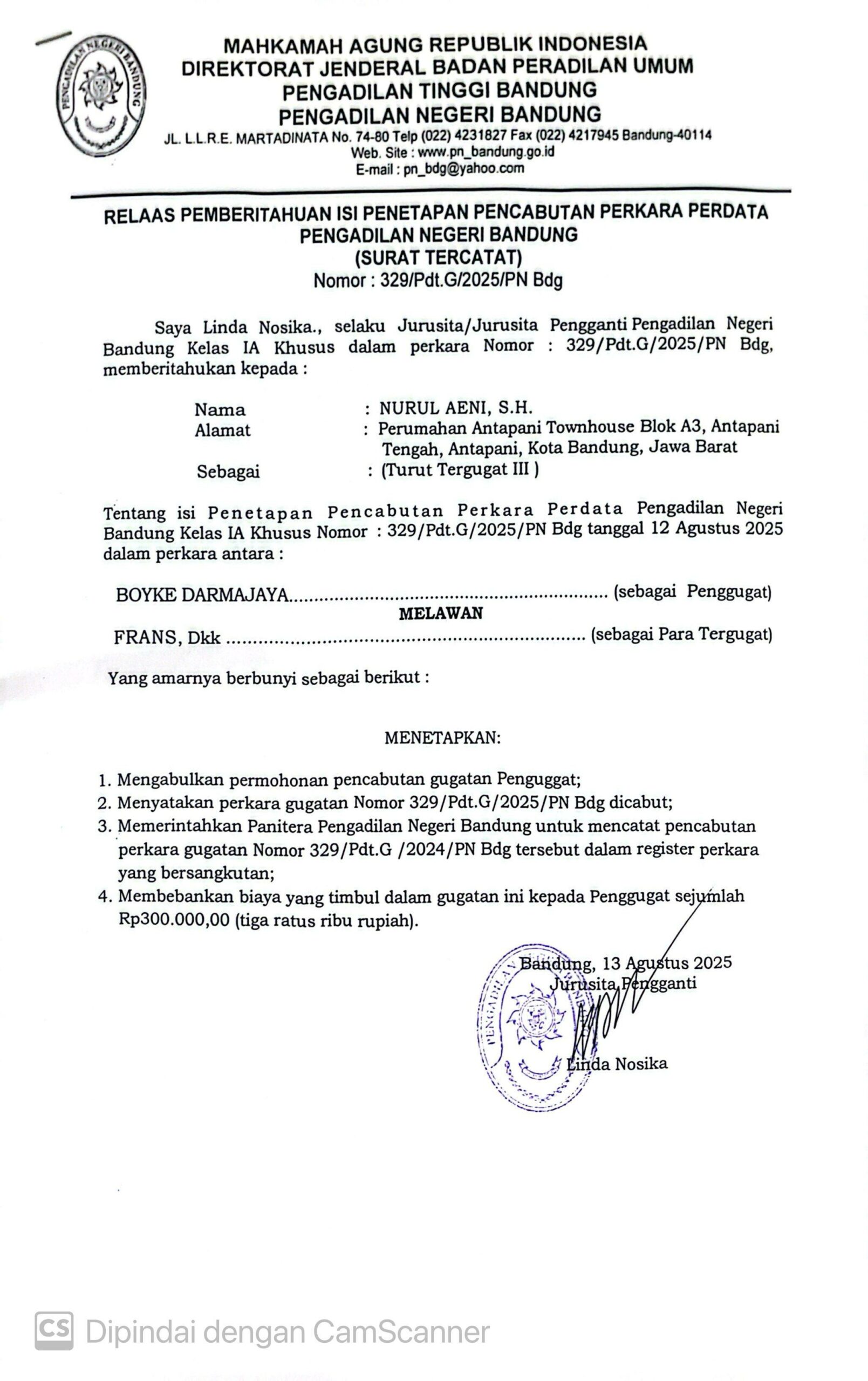 Relaas Pemberitahuan Isi Penetapan Pencabutan Perkara Nomor 329/Pdt.G/2025/PN Bdg