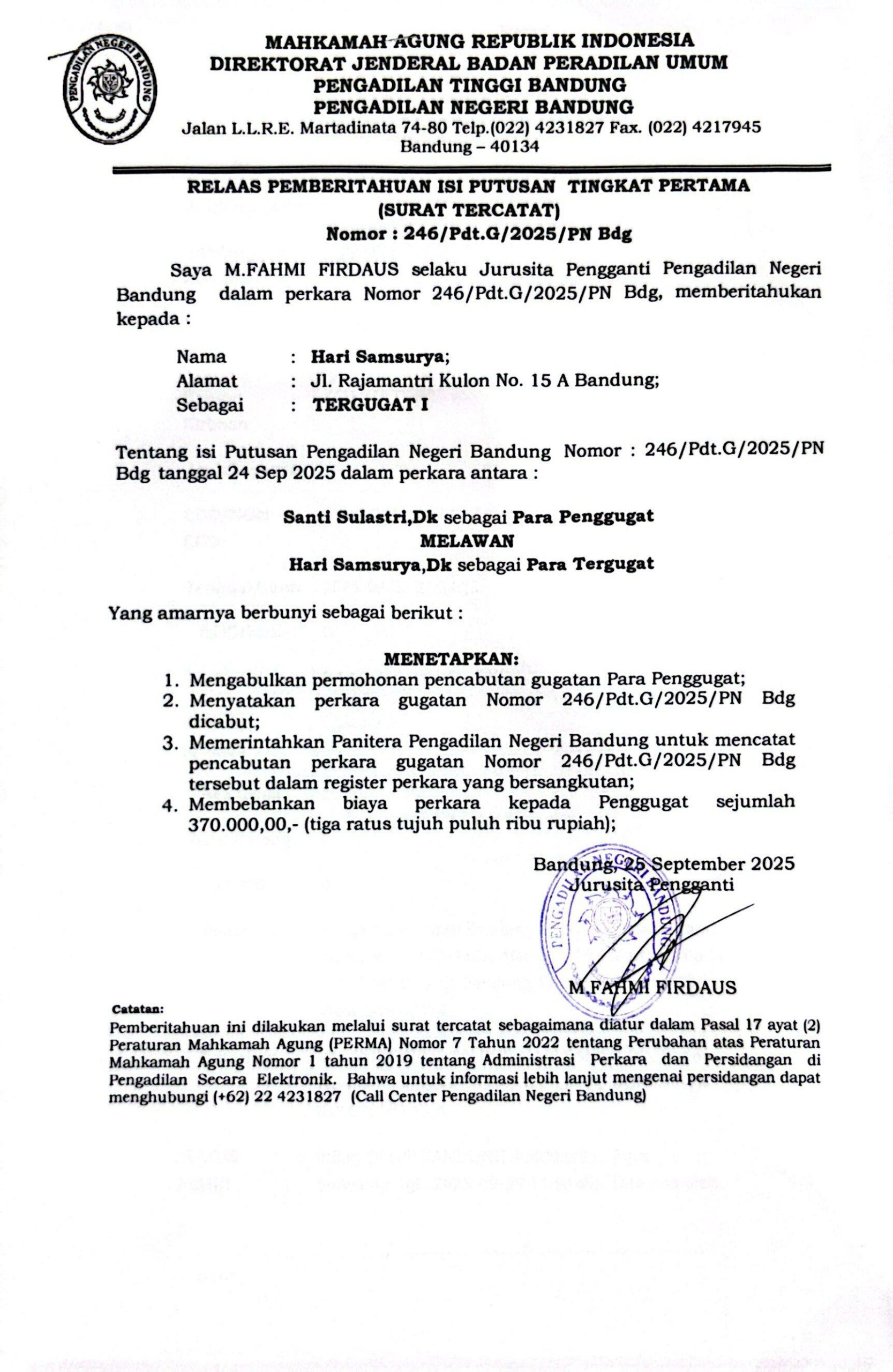 Relaas Pemberitahuan Isi Putusan Nomor : 246/Pdt.G/2025/PN Bdg