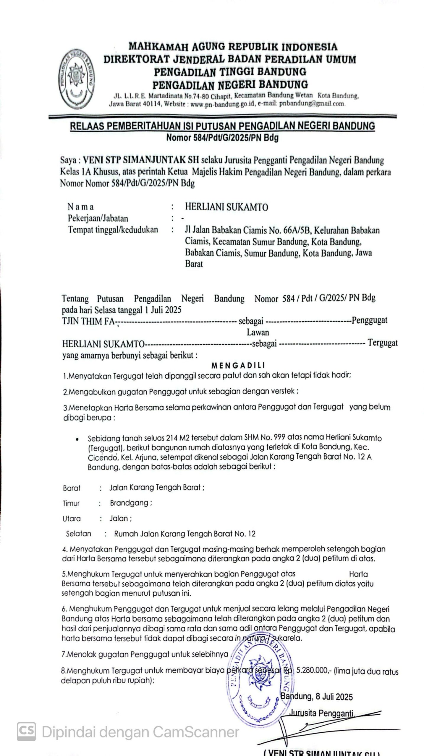 Relaas Pemberitahuan Isi Putusan Nomor 584/Pdt.G/2025/PN Bdg