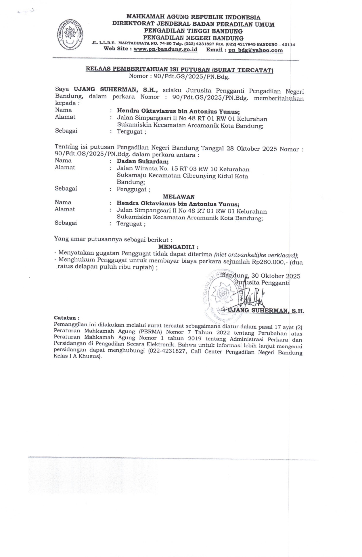 Relaas Pemberitahuan Isi Putusan Nomor: 90/Pdt.G.S/2025/PN Bdg