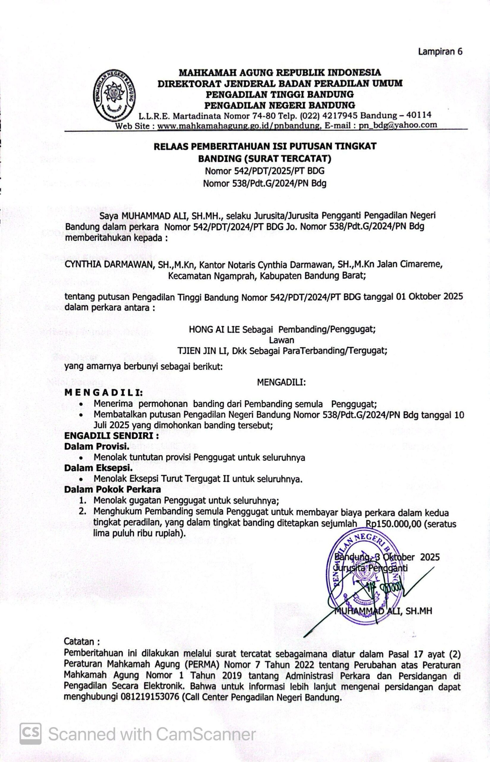 Relaas Pemberitahuan Isi Putusan Tingkat Banding Nomor 542/PDT/2025/PT BDG jo Nomor 538/Pdt.G/2024/PN Bdg