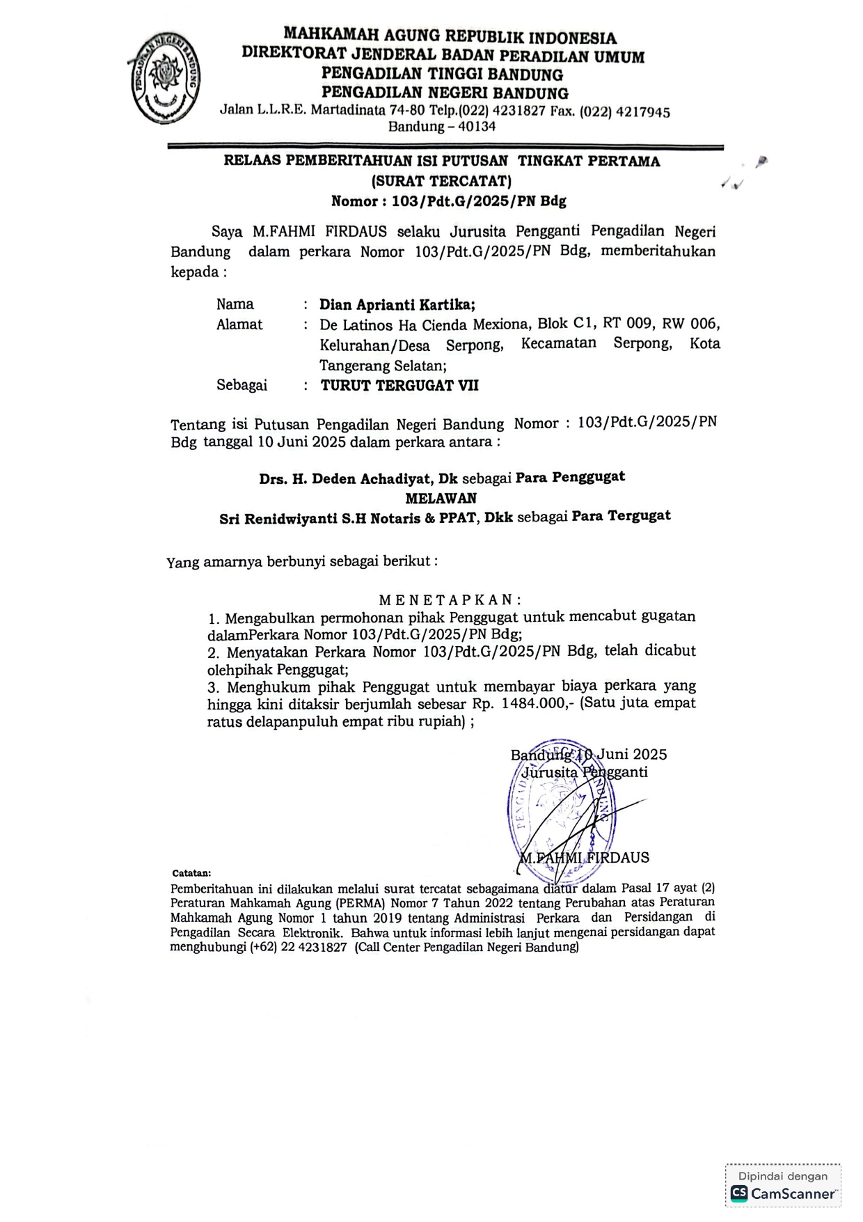 Relaas Pemberitahuan Putusan 103/Pdt.G/2025/PN Bdg