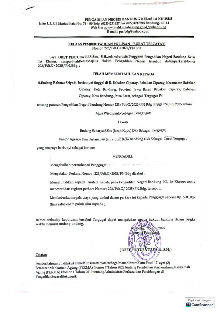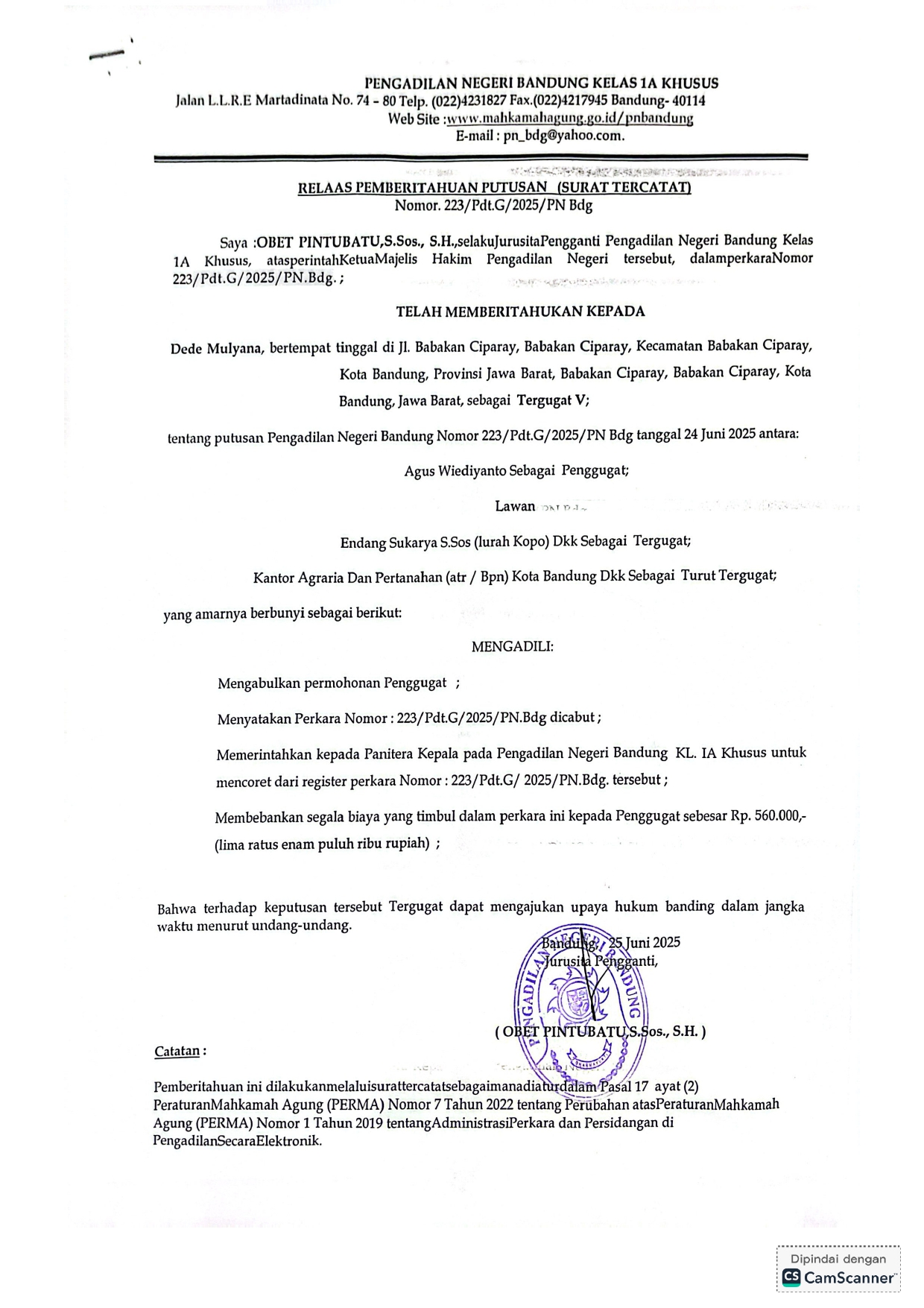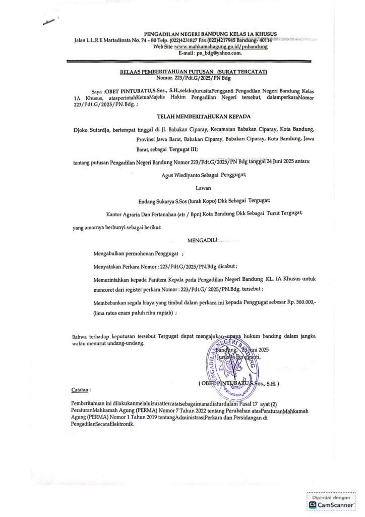Relaas Pemberitahuan Putusan 223/Pdt.G/2025/PN Bdg
