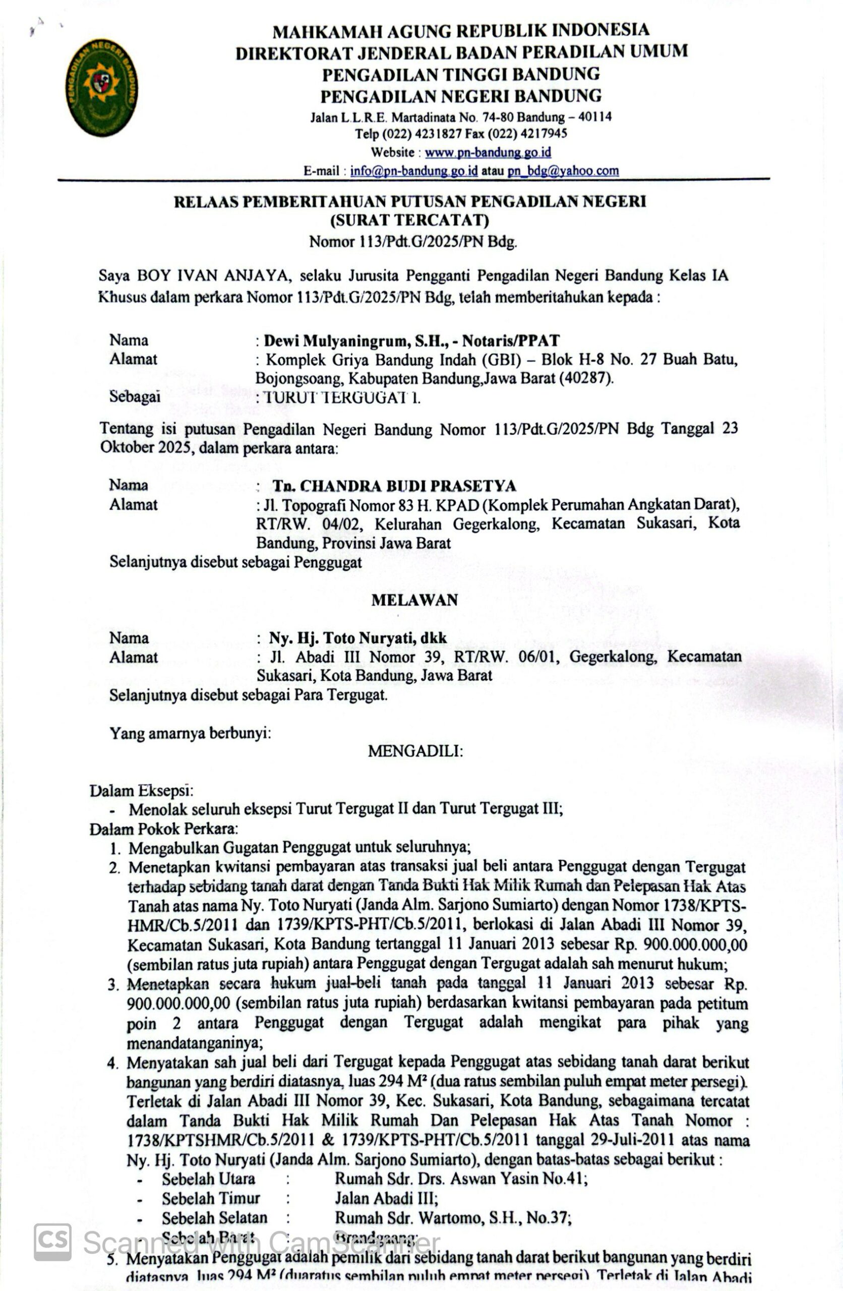 Relaas Pemberitahuan Putusan Nomor 113/Pdt.G/2025/PN Bdg