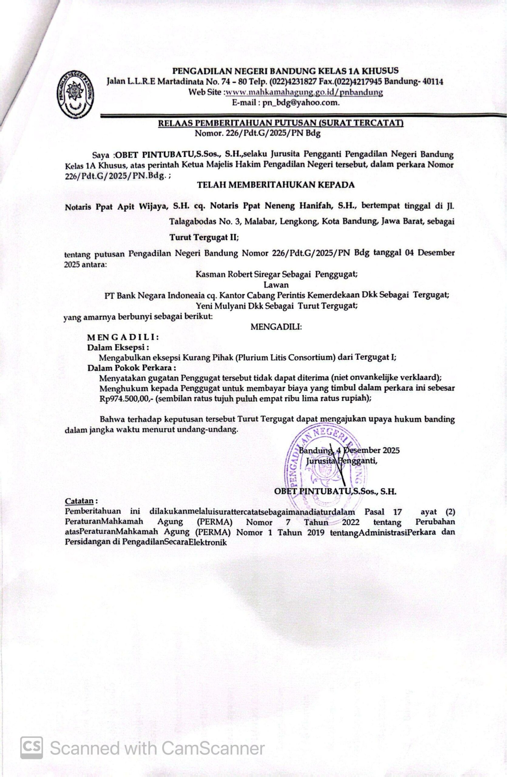 Relaas Pemberitahuan Putusan Nomor 226/Pdt.G/2025/PN Bdg