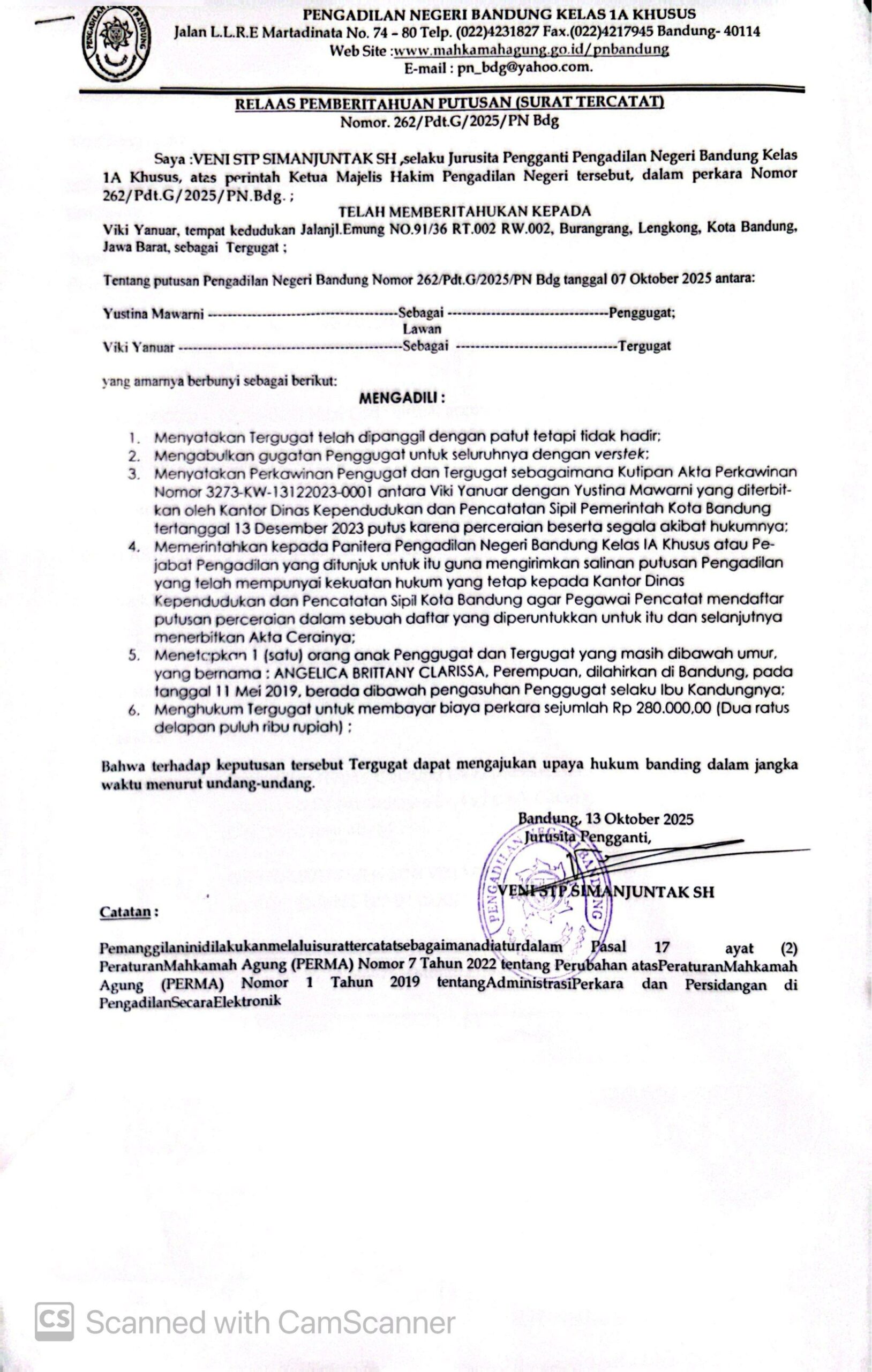 Relaas Pemberitahuan Putusan Nomor 262/Pdt.G/2025/PN Bdg