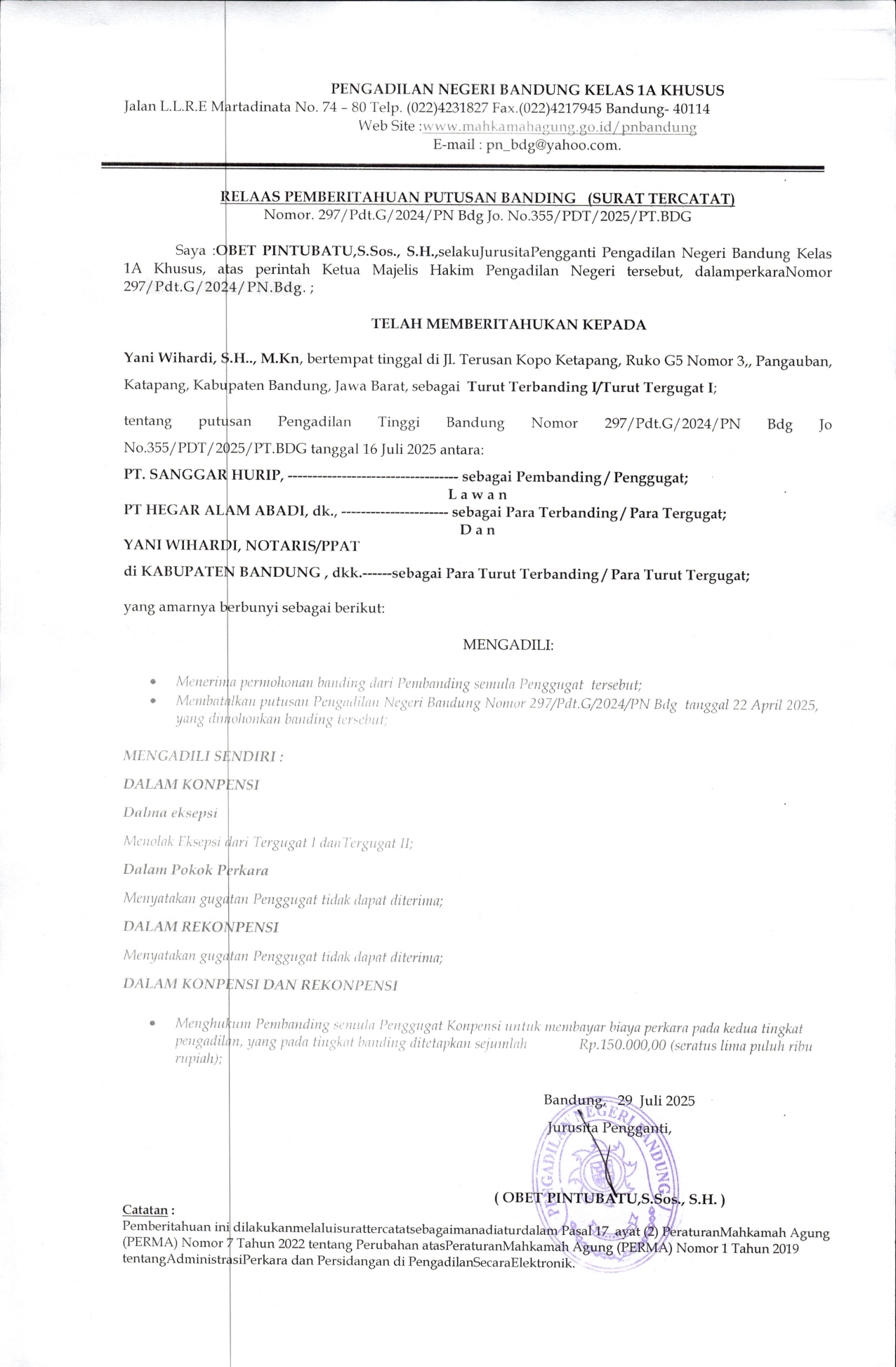 Relaas Pemberitahuan Putusan Nomor 297/Pdt.G/2024 PN Bdg jo Nomor 355/PDT/2025/PT.BDG
