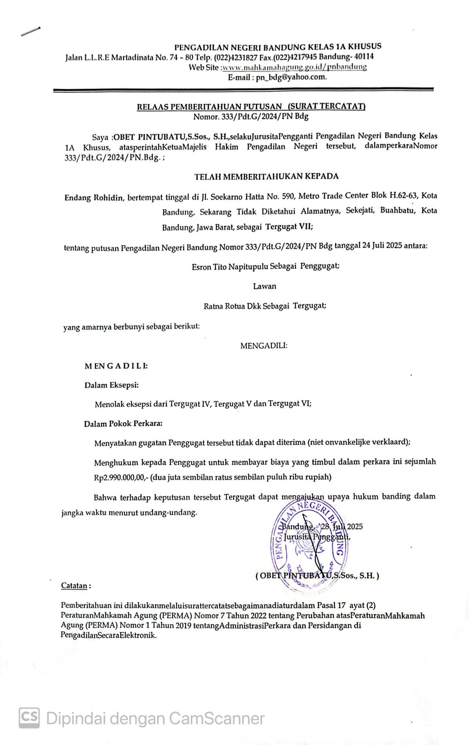 Relaas Pemberitahuan Putusan Nomor 333/Pdt.G/2024/PN Bdg