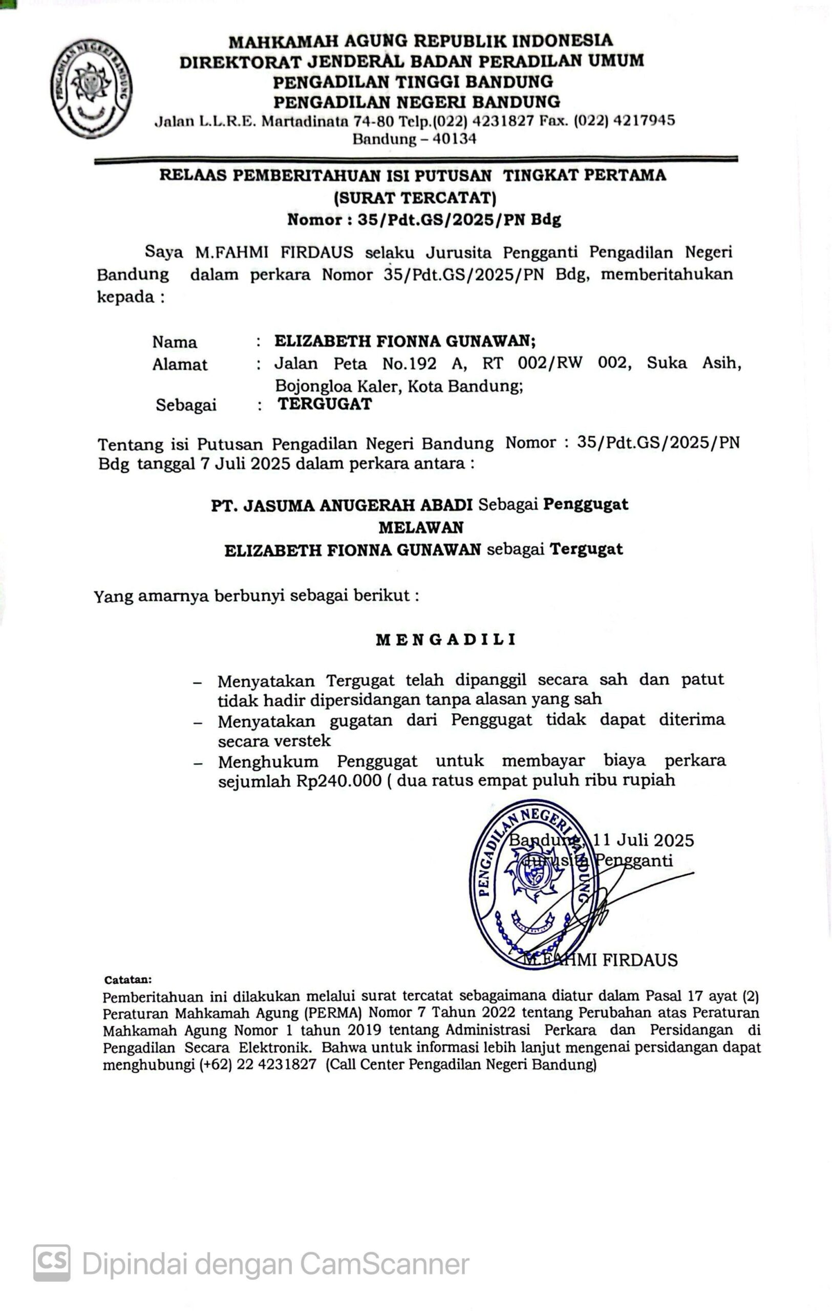 Relaas Pemberitahuan Putusan Nomor 35/Pdt.G.S/2025/PN Bdg
