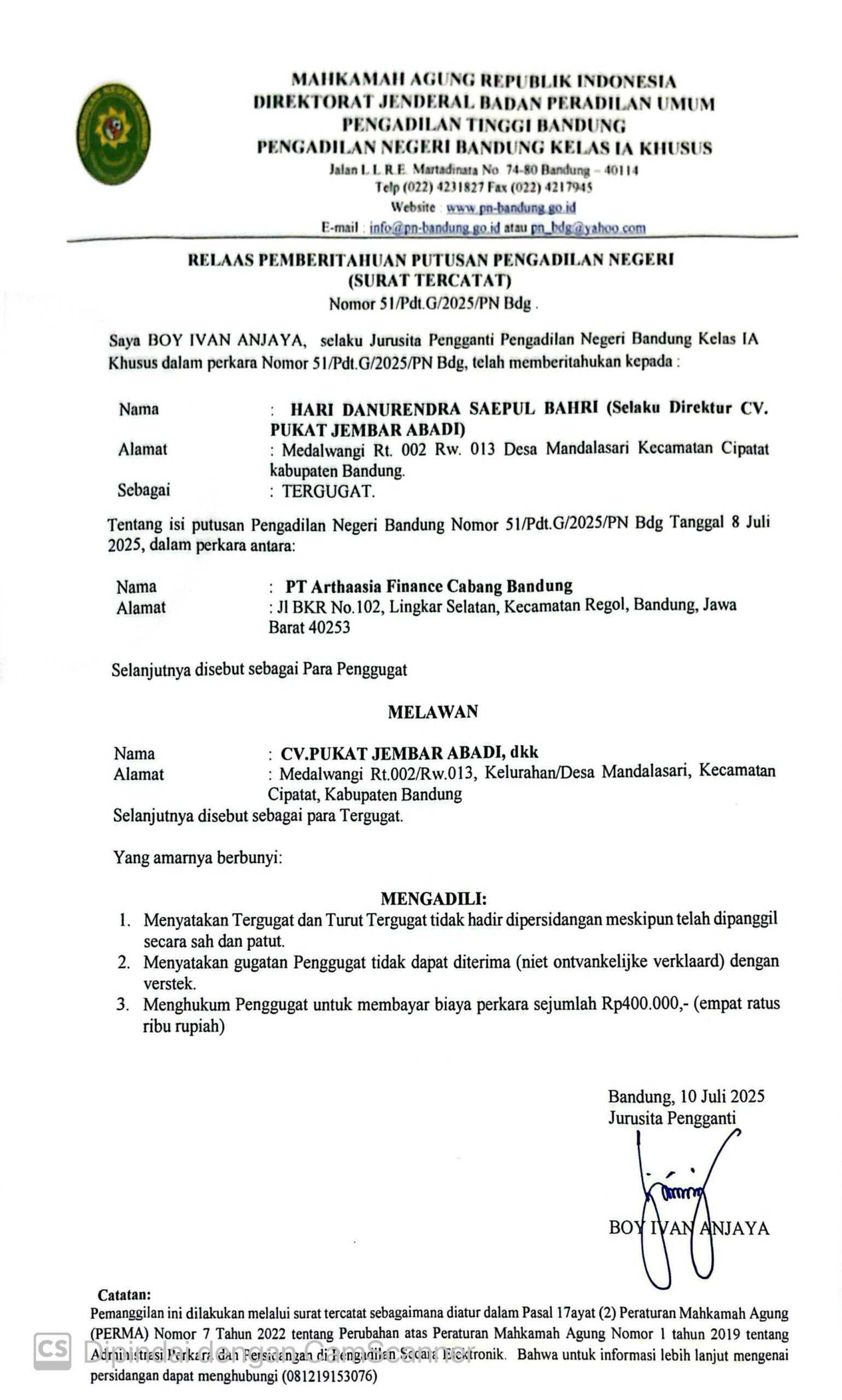 Relaas Pemberitahuan Putusan Nomor 51/Pdt.G/2025/PN Bdg