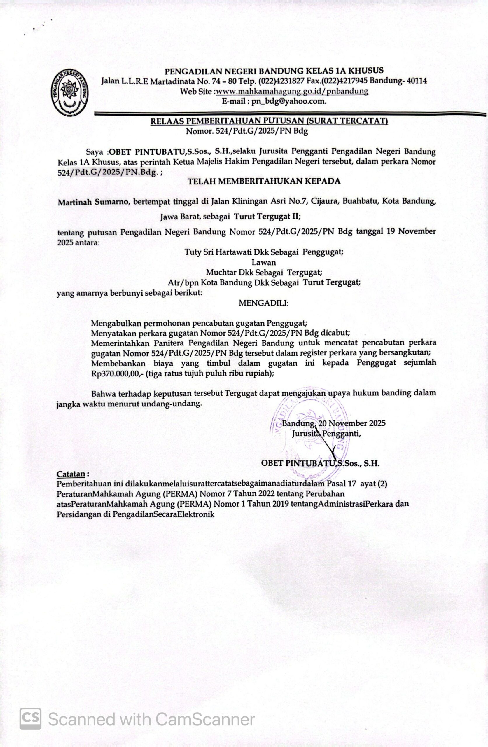 Relaas Pemberitahuan Putusan Nomor 524/Pdt.G/2025/PN Bdg