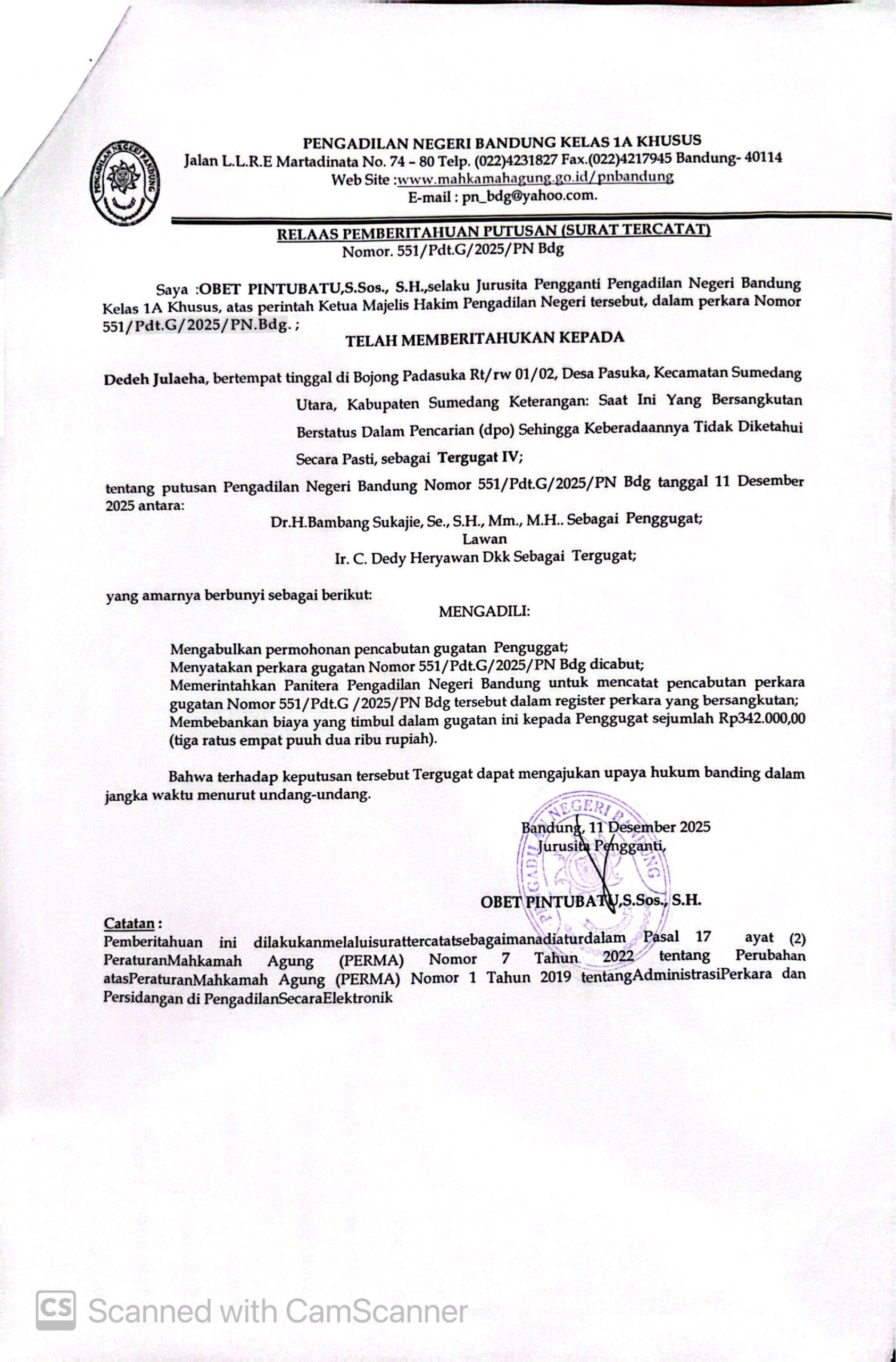 Relaas Pemberitahuan Putusan Nomor 551/Pdt.G/2025/PN Bdg
