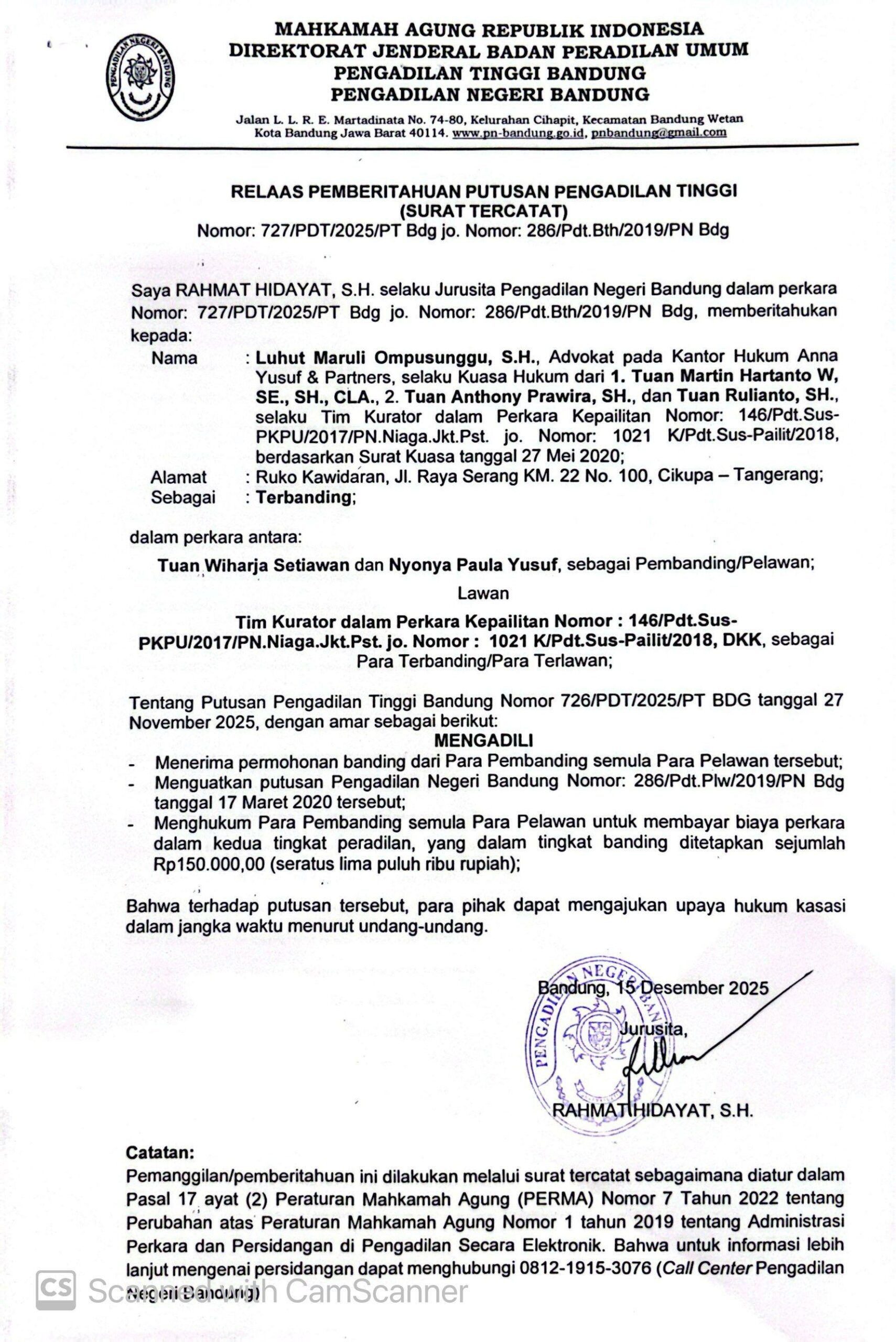 Relaas Pemberitahuan Putusan Pengadilan Tinggi Nomor 727/PDT/2025/PT Bdg Jo. Nomor 286/Pdt.Bth/2019/PN Bdg