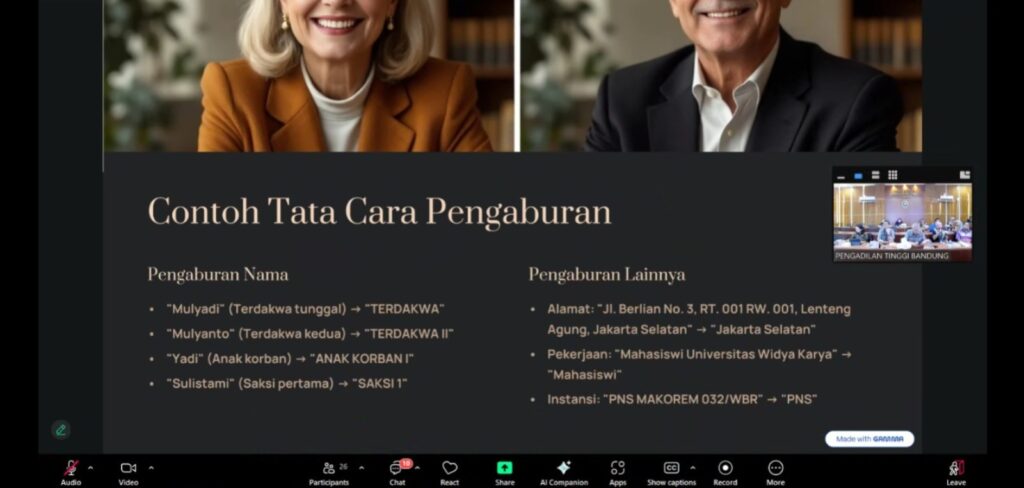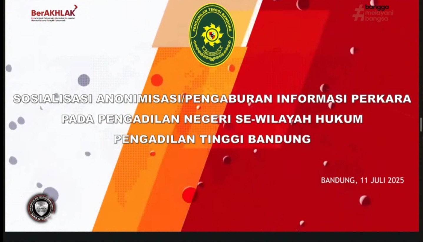 (Kamis, 11 Juli 2025) Sehubungan Surat Keputusan Ketua Mahkamah Agung RI Nomor 2 144/KMA/SK/VIII/2022 tentang Standar Pelayanan Informasi di Pengadilan, khususnya ketentuan mengenai anonimisasi atau pengaburan sebagian informasi dalam putusan atau penetapan perkara, Pengadilan Negeri Bandung turut ikut serta dalam sosialisasi yang diselenggarakan oleh Pengadilan Tinggi Bandung. Kegiatan ini bertujuan untuk menyamakan persepsi dan meningkatkan pemahaman teknis dalam pelaksanaan anonimisasi informasi perkara di lingkungan peradilan. sosialisasi diikuti Ketua, Panitera, Hakim, Panitera Muda Hukum dan Kasub Bag PTIP.