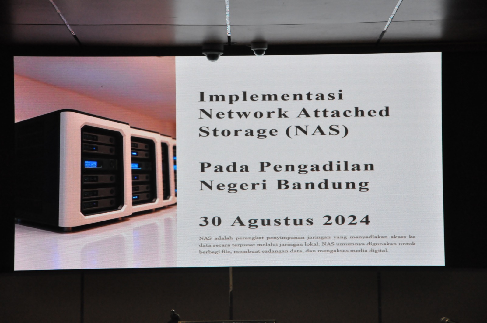 Sosialisasi NAS (Network Attached Storage) pada Pengadilan Negeri Bandung oleh Kepala Sub Bagian Perencanaan, Teknologi Informasi dan Pelaporan, Bapak Mohammad Nur Fitriyadi, S.Kom., M.Kom., diikuti oleh seluruh Aparatur Pengadilan Negeri Bandung, bertempat di Ruang Sidang Utama Pengadilan Negeri Bandung.